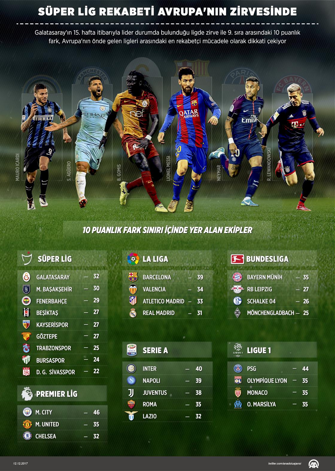 Türkiye'nin futbolda en üst organizasyonu olan Süper Lig'deki rekabet, Avrupa önde gelen ligleri arasında en mücadeleli yarış durumunda. Galatasaray'ın 15. hafta itibarıyla 32 puanla lider durumda bulunduğu Süper Lig'de takımlar birbirlerine oldukça yakın puanlarda bulunurken, zirve ile 9. sıra arasındaki fark yalnızca 10 puanla sınırlı.