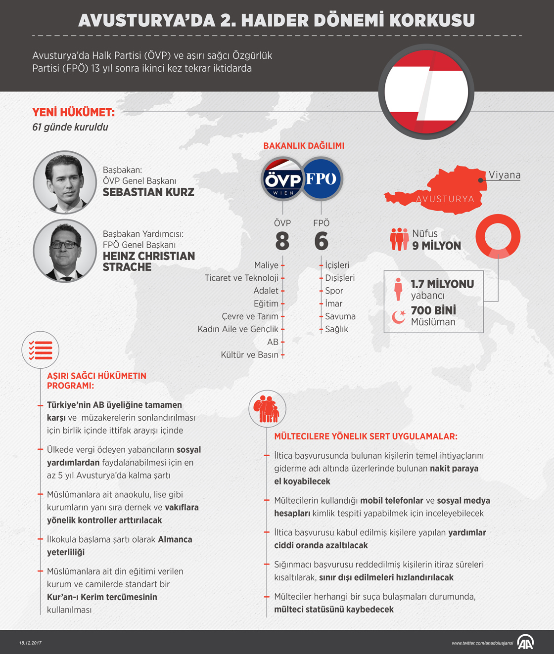 Avusturya’da 13 yıl sonra ikinci kez ve daha güçlü bir şekilde iktidara gelen Halk Partisi (ÖVP) ve aşırı sağcı Özgürlük Partisi (FPÖ) koalisyonunun yabancı ve sığınmacı karşıtı hükümet programı, ikinci bir "Haider" dönemi yaşanacağı korkusuna neden oluyor. ( Murat Usubaliev - Anadolu Ajansı )18 Aralık 2017•Güncelleme: 18 Aralık 2017