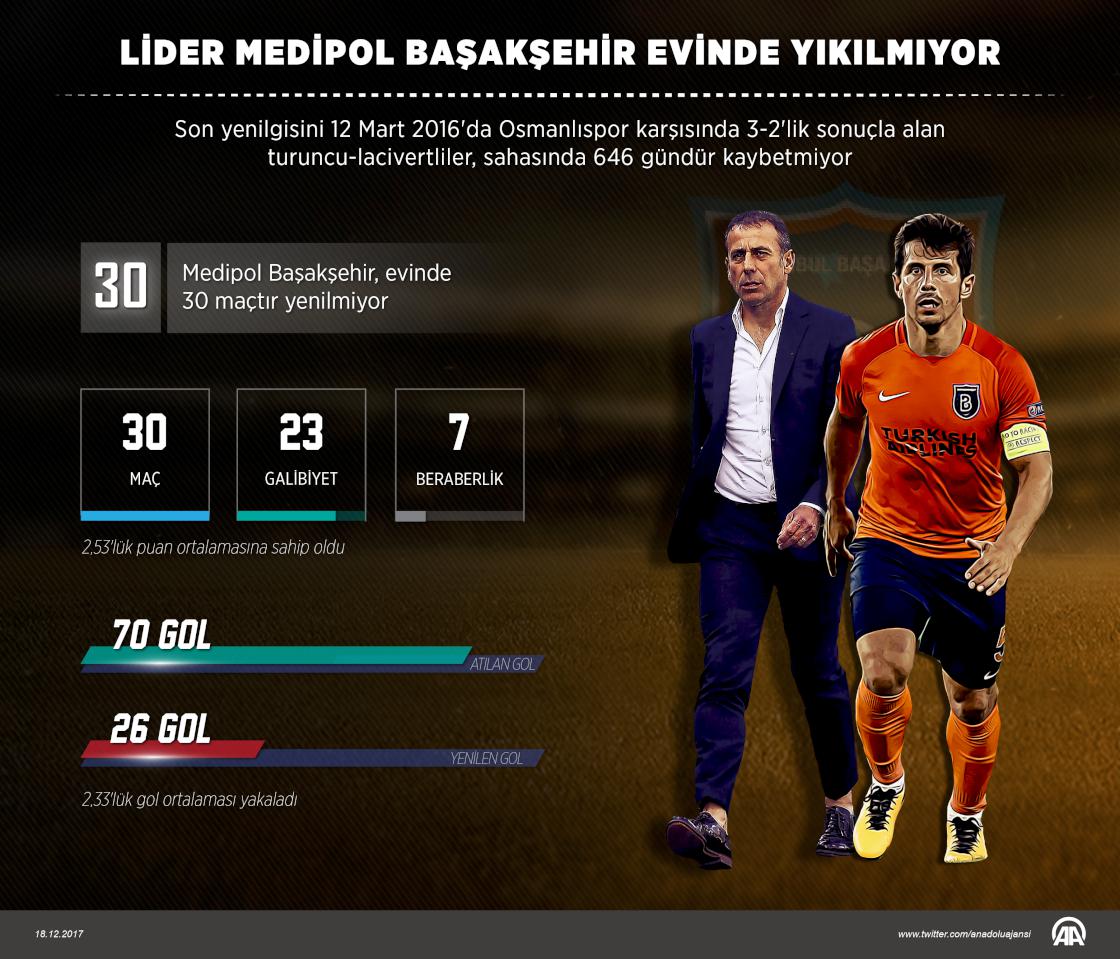 Süper Lig'in 16. haftasında Antalyaspor'u 4-1 mağlup ederek, Galatasaray'ın 1 puan önünde yeniden liderliğe yükselen Medipol Başakşehir, sahasındaki yenilmezliğini de sürdürüyor. Turuncu-lacivertliler evinde oynadığı son 30 Süper Lig maçında yenilgi yüzü görmedi. Abdullah Avcı'nın ekibi, bu 30 maçta 23 galibiyet alırken, 7 karşılaşmada da sahadan beraberlikle ayrıldı. Medipol Başakşehir bu süreçte 76 puanı hanesine yazdırdı, maç başına puan ortalaması ise 2,53 oldu. ( Kemal Delikmen - Anadolu Ajansı )18 Aralık 2017•Güncelleme: 18 Aralık 2017
