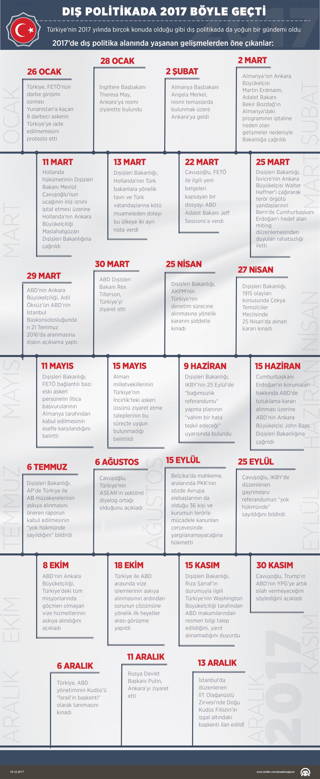 Türkiye'de dış politika alanında IKBY'de düzenlenen gayrimeşru bağımsızlık referandumu, Almanya ve Hollanda gibi bazı Avrupa ülkeleriyle yaşanan gerginlikler, ABD ile Suriye'nin kuzeyinde terör örgütüne verdiği destek nedeniyle devam eden olumsuzluğun yanı sıra ortaya çıkan vize krizi ve Suriye'de gerginliği azaltma bölgelerinin oluşturulması gibi konular öne çıktı. ( Gözde Gültekinler - Anadolu Ajansı )18 Aralık 2017•Güncelleme: 18 Aralık 2017