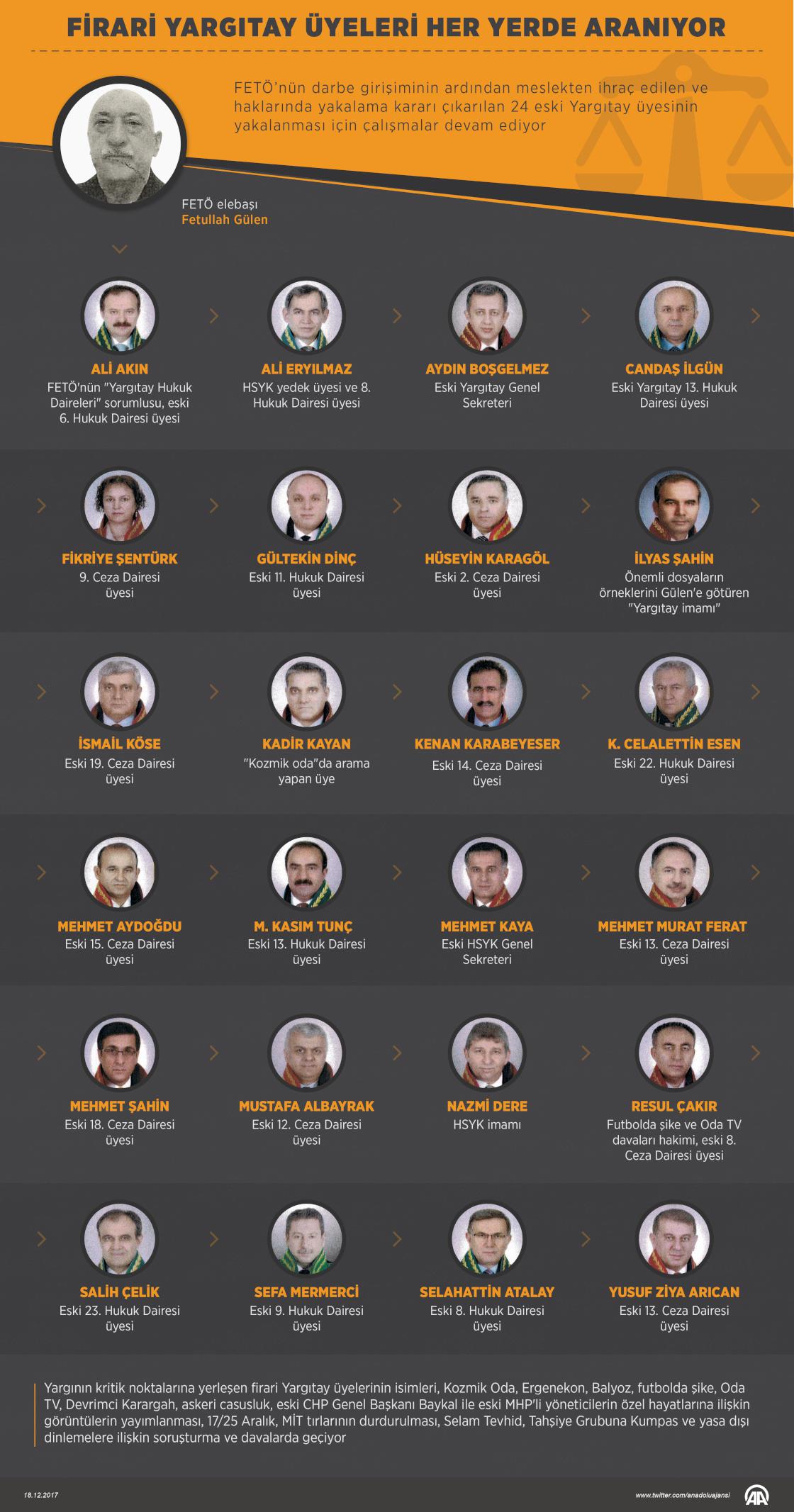 Fetullahçı Terör Örgütü'nün (FETÖ) darbe girişiminin ardından meslekten ihraç edilen ve haklarında yakalama kararı çıkarılan 24 eski Yargıtay üyesinin yakalanması için çalışmalar devam ediyor. FETÖ'nün darbe girişimi sonrası Ankara Cumhuriyet Başsavcılığınca başlatılan soruşturma kapsamında, 18 Temmuz 2016'da haklarında gözaltı kararı verilen firari eski Yargıtay üyeleri Ali Akın, Ali Eryılmaz, Aydın Boşgelmez, Candaş İlgün, Fikriye Şentürk, Gültekin Dinç, Hüseyin Karagöl, İlyas Şahin, İsmail Köse, Kadir Kayan, Kenan Karabeyeser, Kuddusi Celalettin Esen, Mehmet Aydoğdu, Mehmet Kasım Tunç, Mehmet Kaya, Mehmet Murat Ferat, Mehmet Şahin, Mustafa Albayrak, Nazmi Dere, Resul Çakır, Salih Çelik, Sefa Mermerci, Selahattin Atalay ve Yusuf Ziya Arıcan'ın yakalanması için yaklaşık 17 aydır çalışmalar sürüyor. ( Muhammed Ali Yiğit - Anadolu Ajansı )18 Aralık 2017•Güncelleme: 18 Aralık 2017