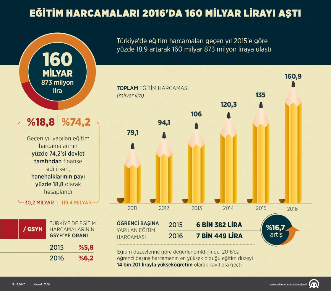 Türkiye'de eğitim harcamaları, geçen yıl 2015'e göre yüzde 18,9 artarak 160 milyar 873 milyon liraya ulaştı. ( Murat Usubaliev - Anadolu Ajansı )
