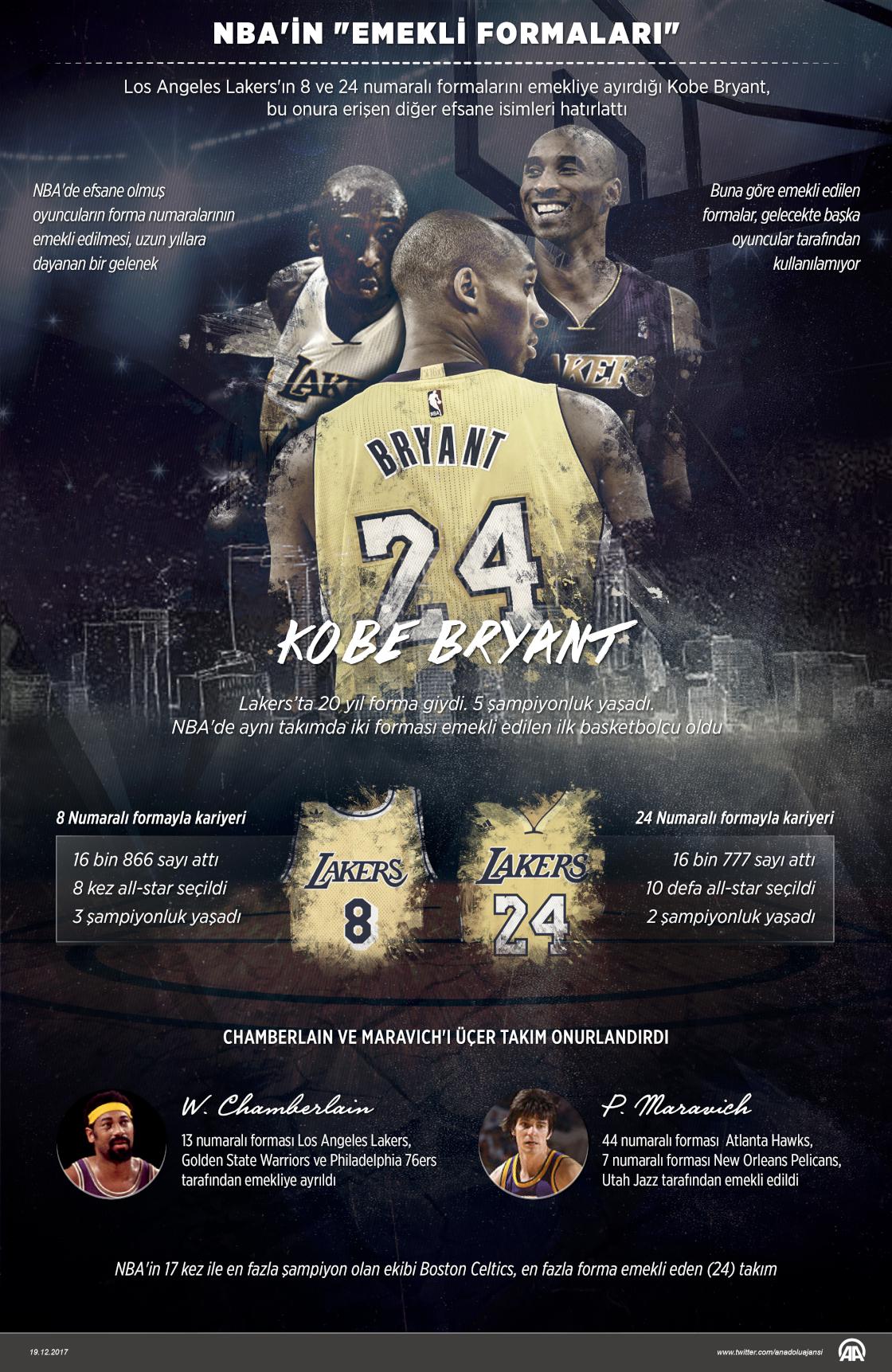 Amerikan Basketbol Ligi'nde (NBA) Los Angeles Lakers'ın formalarını emekliye ayırdığı Kobe Bryant, daha önce bu onura layık görülen efsane isimleri akıllara getirdi. NBA'de efsane haline gelmiş oyuncuların forma numaralarının emekli edilmesi, uzun yıllara dayanan bir gelenek. Son olarak Lakers, efsane basketbolcusu Kobe Bryant'ın 8 ve 24 numaralı formalarını, Golden State Warriors'a uzatmada 116-114 kaybedilen karşılaşmanın devre arasında emekli ederek Staples Center'a yerleştirdi. Lakers'ta oynadığı 20 senede 5 şampiyonluk yaşayarak efsane haline gelen ve bu onura ulaşan Bryant, NBA'de aynı takımda iki forması emekli edilen ilk basketbolcu olarak tarihe geçti. ( Kemal Delikmen - Anadolu Ajansı )19 Aralık 2017•Güncelleme: 19 Aralık 2017