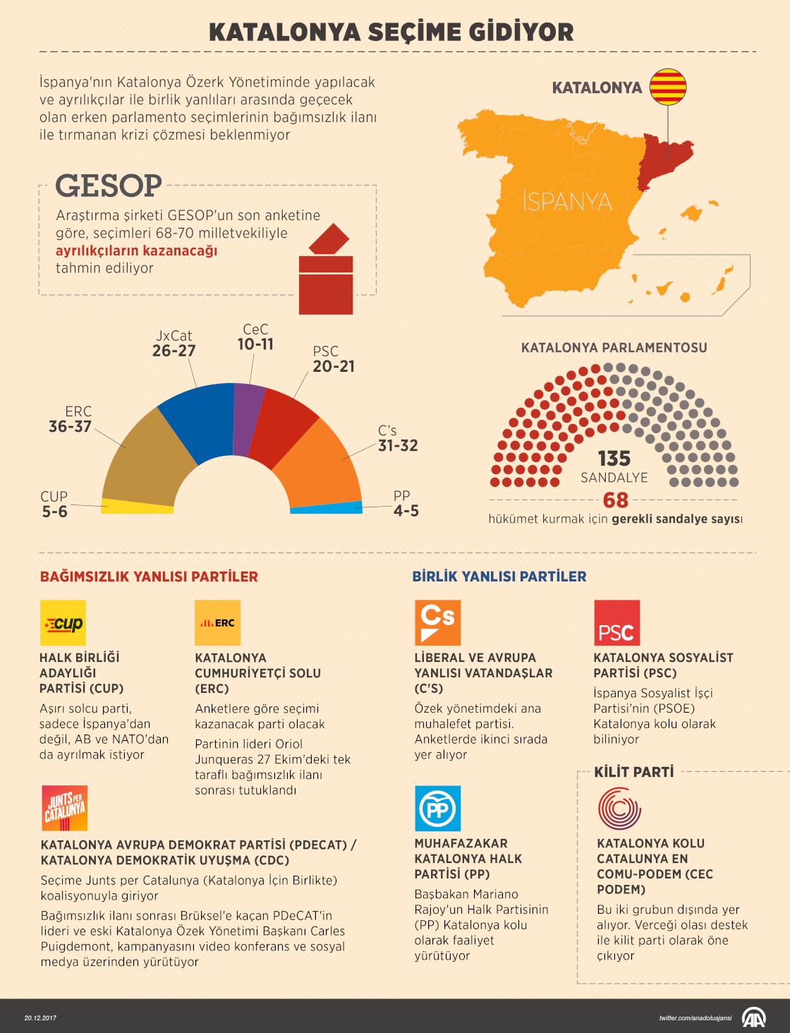 İspanya'nın Katalonya Özerk Yönetiminde yapılacak ve ayrılıkçılar ile birlik yanlıları arasında geçecek olan erken parlamento seçimlerinin bağımsızlık ilanı ile tırmanan krizi çözmesi beklenmiyor. ( Murat Usubaliev - Anadolu Ajansı )