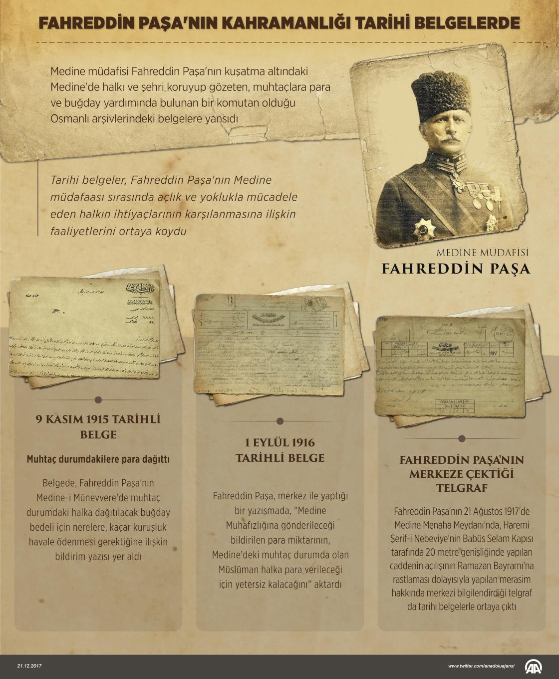 Medine müdafisi Fahreddin Paşa'nın kuşatma altındaki Medine'de halkı ve şehri koruyup gözeten, muhtaç olanlara para ve buğday yardımında bulunan bir komutan olduğu Osmanlı arşivlerinde bulunan belgelere de yansıdı. Birleşik Arap Emirlikleri (BAE) Dışişleri Bakanı Abdullah bin Zayed'in, Twitter'da bir kullanıcının mesajını paylaşmasıyla gündeme gelen Medine müdafisi Fahreddin Paşa'nın gösterdiği şanlı direniş sırasında halkının her türlü ihtiyacını düşündüğü, Devlet Arşivleri Genel Müdürlüğü bünyesinde bulunan Osmanlı arşivlerindeki tarihi belgelerle ortaya çıktı. ( Kemal Delikmen - Anadolu Ajansı )21 Aralık 2017•Güncelleme: 21 Aralık 2017