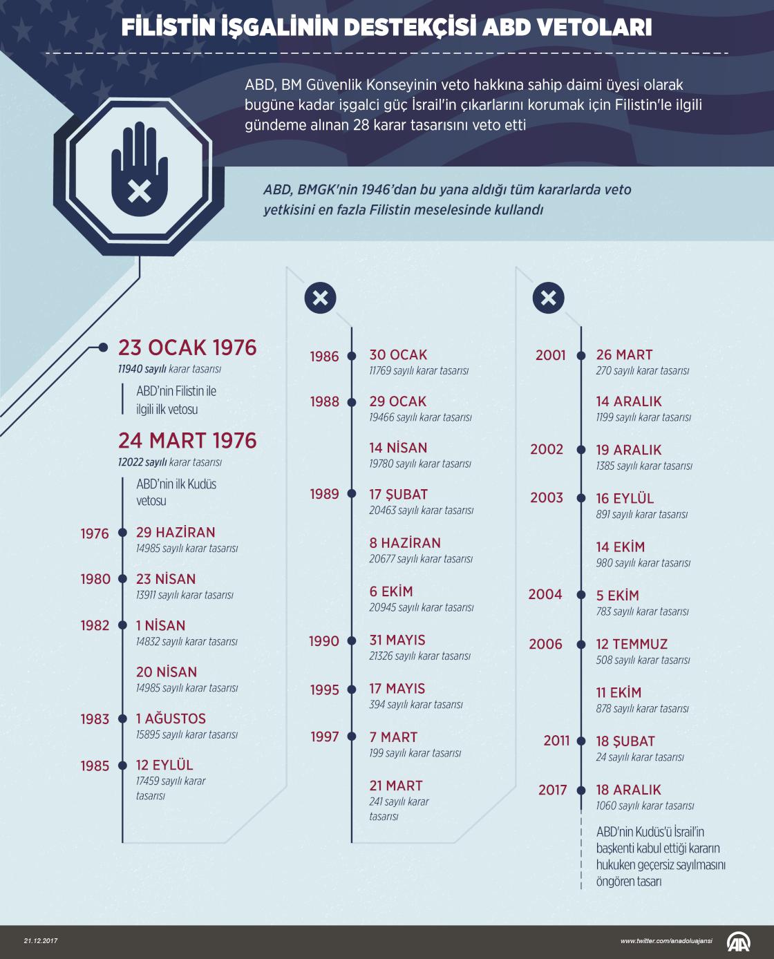 ABD, BM Güvenlik Konseyinin veto hakkına sahip daimi üyesi olarak bugüne kadar işgalci güç İsrail'in çıkarlarını korumak için Filistin'le ilgili gündeme alınan 28 karar tasarısını veto etti. Washington yönetimi, veto yetkisini en çok bu meselede kullandı.