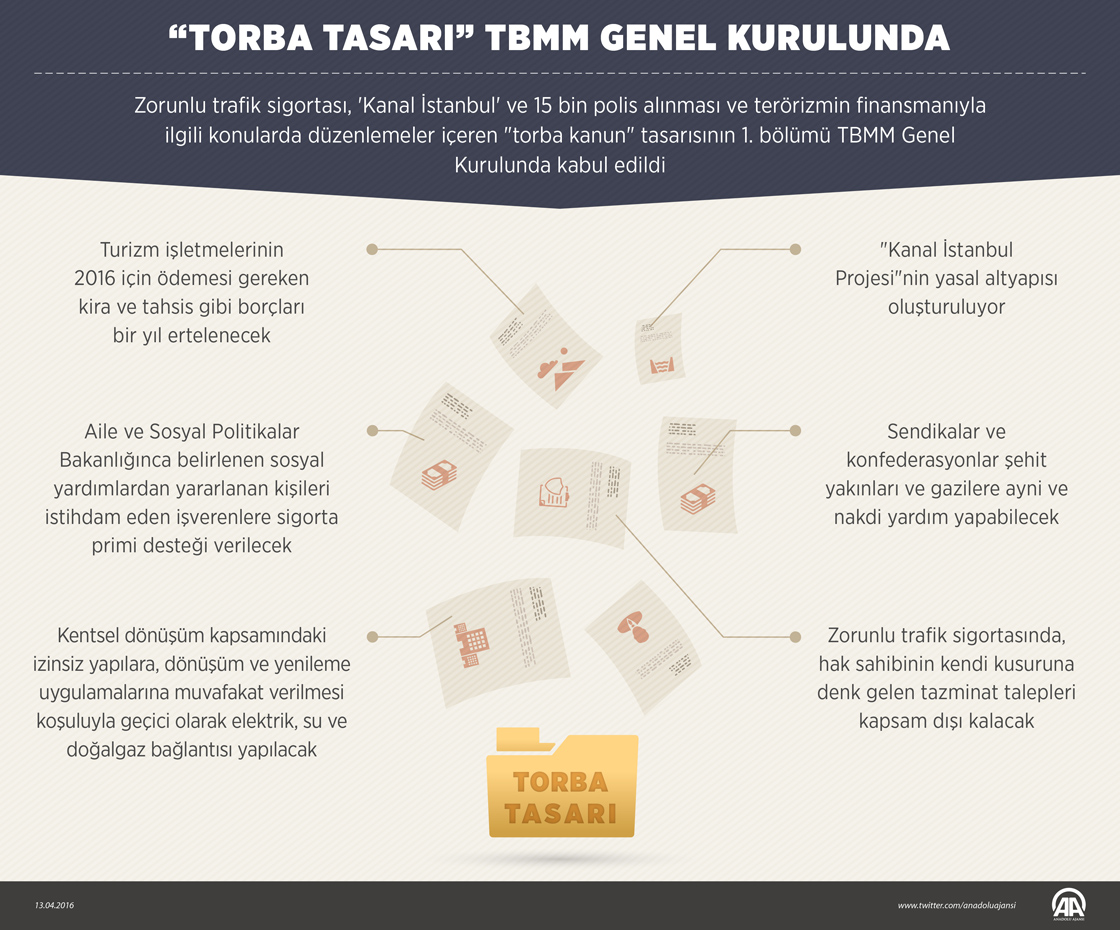 "Zorunlu trafik sigortası, Diyarbakır'ın Sur ilçesinin yeniden inşası, 'Kanal İstanbul', 25 yaşa kadar genel sağlık sigortası primlerinin silinmesi, 15 bin polis alınması ve terörizmin finansmanıyla" ilgili konularda düzenlemeler içeren "torba kanun" tasarısının 1. bölümü, TBMM Genel Kurulunda kabul edildi. ( Grafik: Yasin Demirci - Anadolu Ajansı )13 Nisan 2016•Güncelleme: 14 Nisan 2016