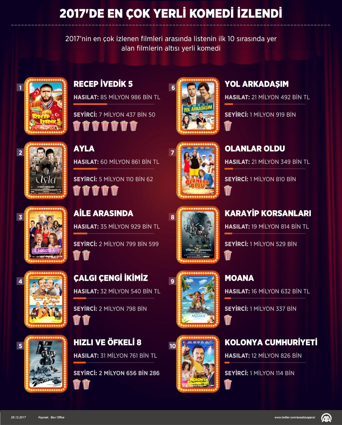 2017’nin en çok izlenen filmlerinin ilk 10 sırasında yer alan yapımların altısı yerli komedi. ( Yasin Demirci - Anadolu Ajansı )