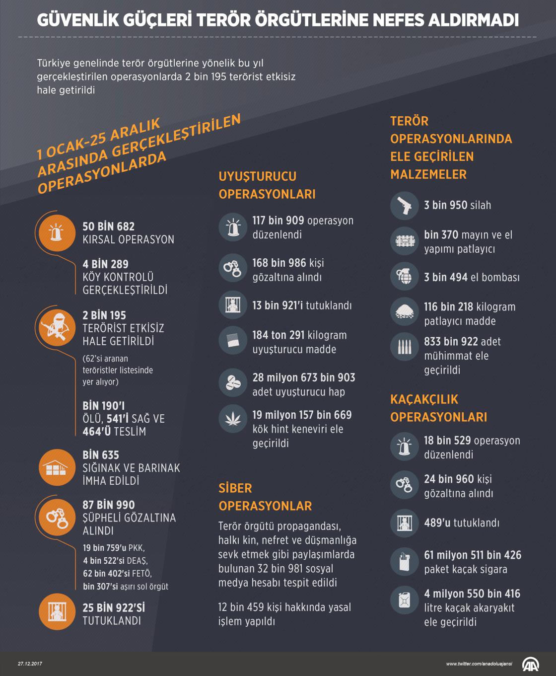 Türkiye genelinde terör örgütlerine yönelik bu yıl gerçekleştirilen operasyonlarda 2 bin 195 terörist etkisiz hale getirildi. Etkisiz hale getirilen teröristlerden 62'sinin "aranan teröristler" listesinde yer aldığı, 62'sinin ise listede bulunmayan sözde üst düzey yöneticiler olduğu belirlendi ( Yasin Demirci - Anadolu Ajansı )27 Aralık 2017•Güncelleme: 27 Aralık 2017