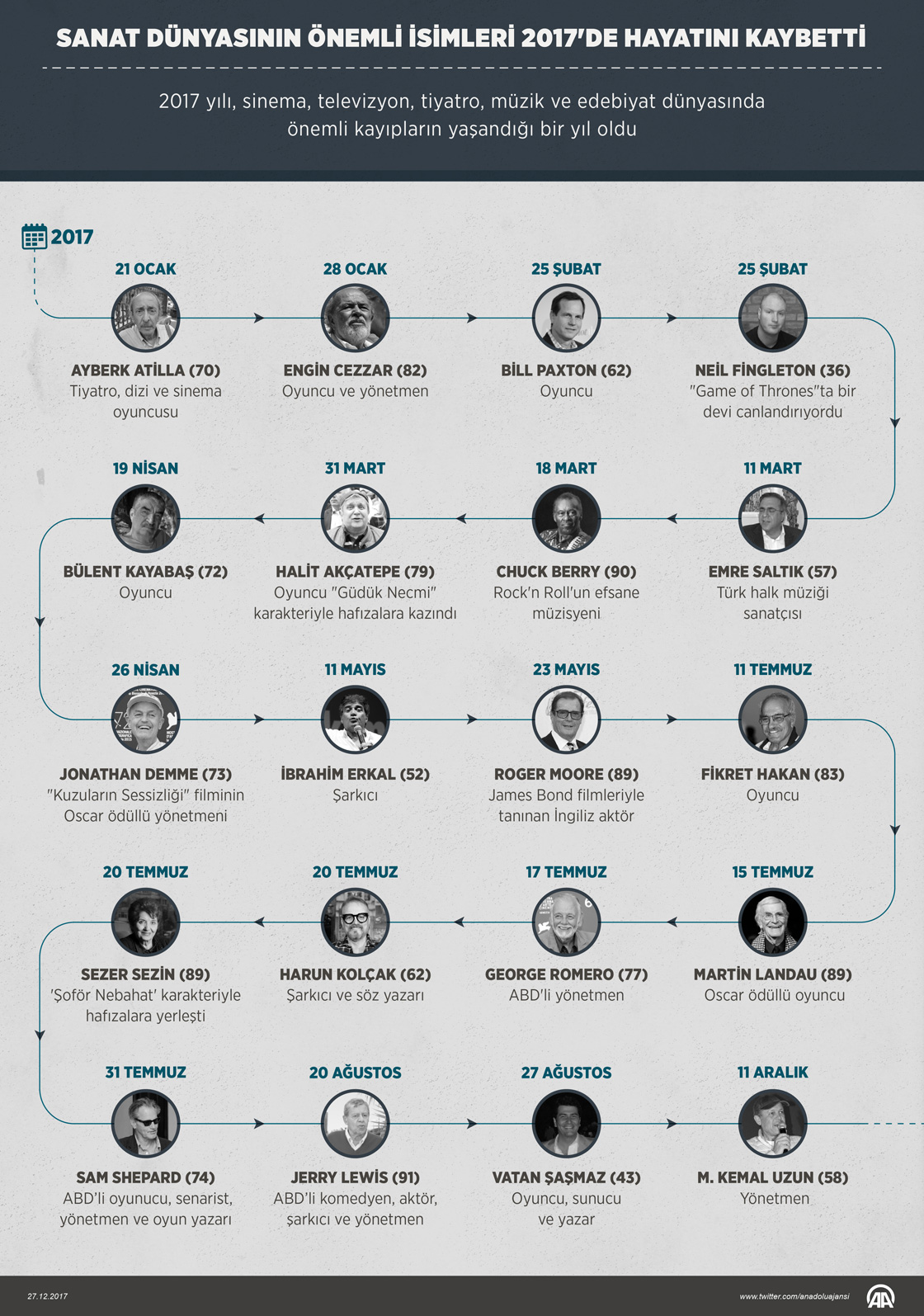 2017, sinema, televizyon, tiyatro, müzik ve edebiyat dünyasında önemli kayıpların yaşandığı bir yıl oldu. Ayberk Atilla, Emre Saltık, Engin Cezzar, Halit Akçatepe, Bülent Kayabaş, İbrahim Erkal, Hakan Balamir, Fikret Hakan, Harun Kolçak, Vatan Şaşmaz, Sezer Sezin ve Ali Tekintüre hayata veda etti. ( Muhammed Ali Yiğit - Anadolu Ajansı )27 Aralık 2017•Güncelleme: 27 Aralık 2017