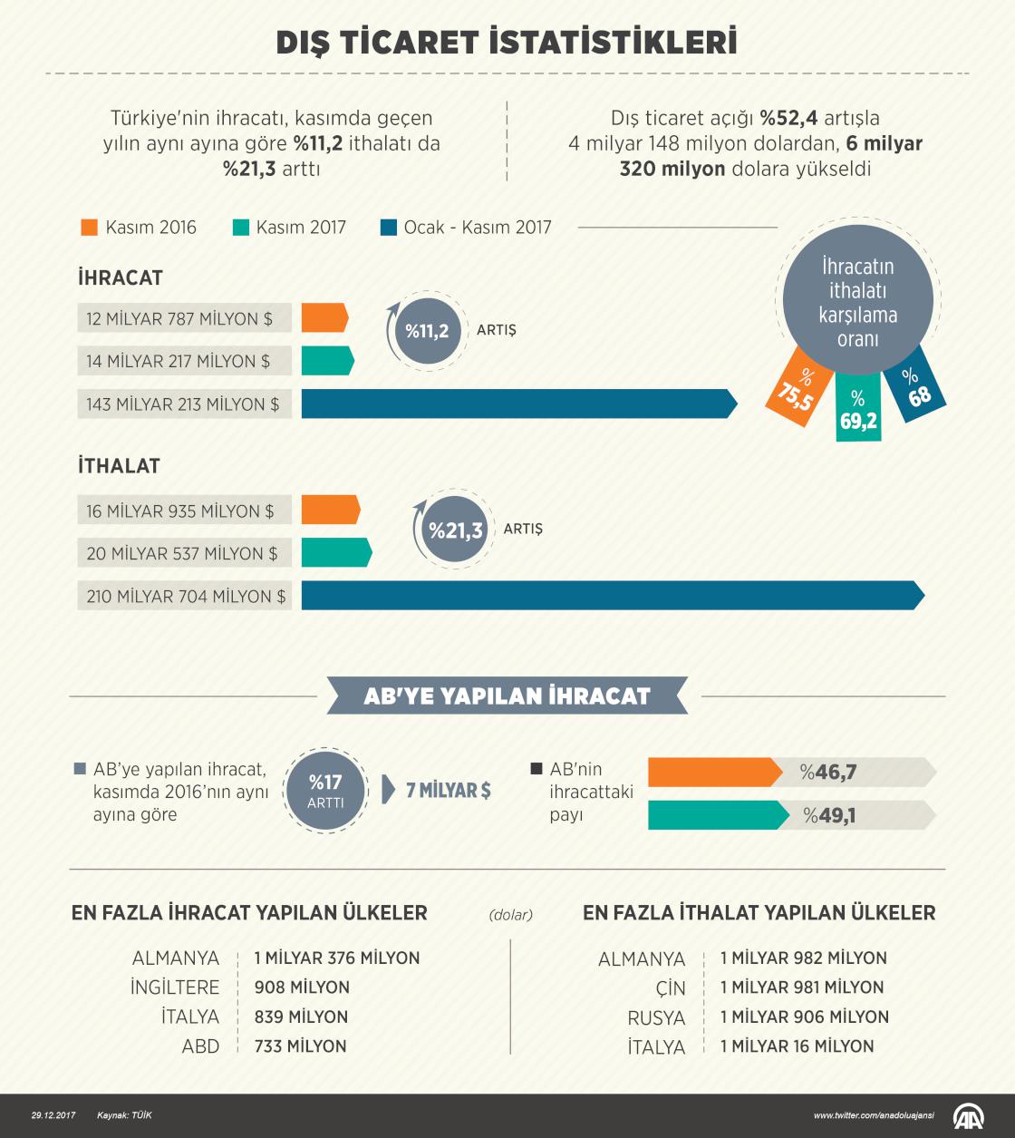 Türkiye İstatistik Kurumu (TÜİK) ile Gümrük ve Ticaret Bakanlığı tarafından oluşturulan kasım ayına ilişkin geçici dış ticaret istatistikleri açıklandı. Buna göre, ihracat kasımda geçen yılın aynı ayına göre yüzde 11,2 artışla 14 milyar 217 milyon dolara ulaştı. İthalat ise yüzde 21,3 artarak 20 milyar 537 milyon dolar oldu. ( Muhammed Ali Yiğit - Anadolu Ajansı )29 Aralık 2017•Güncelleme: 29 Aralık 2017