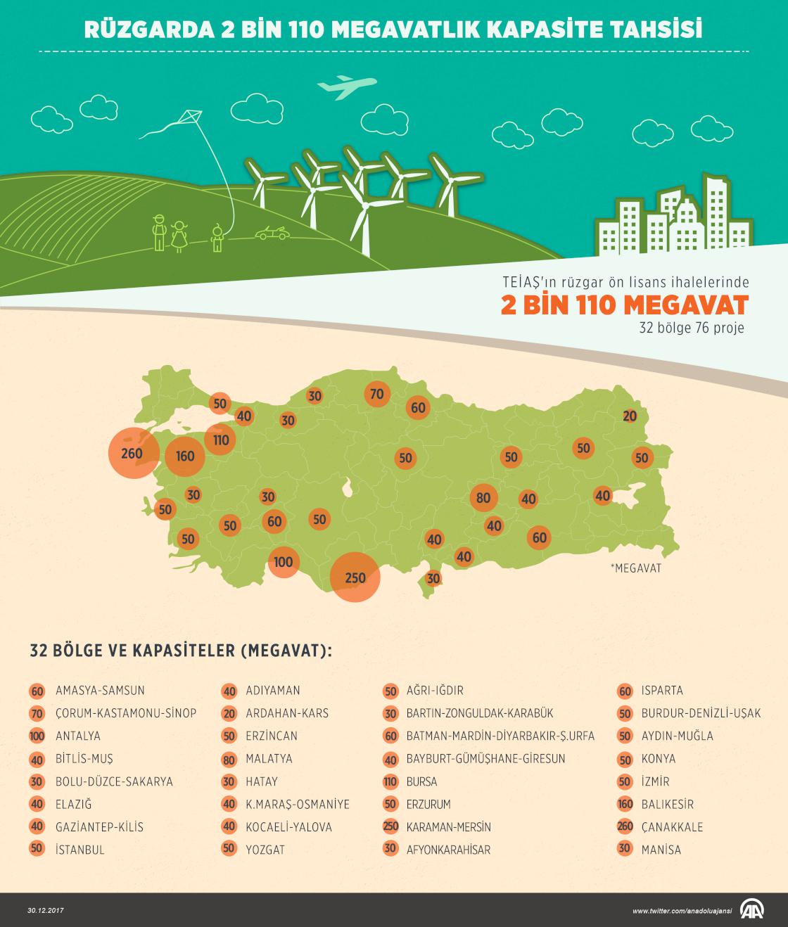 Türkiye Elektrik İletim AŞ'ın (TEİAŞ) rüzgar ön lisans ihalelerinde 32 bölge için 76 projeye toplam 2 bin 110 megavatlık kapasite tahsisi yapıldı.