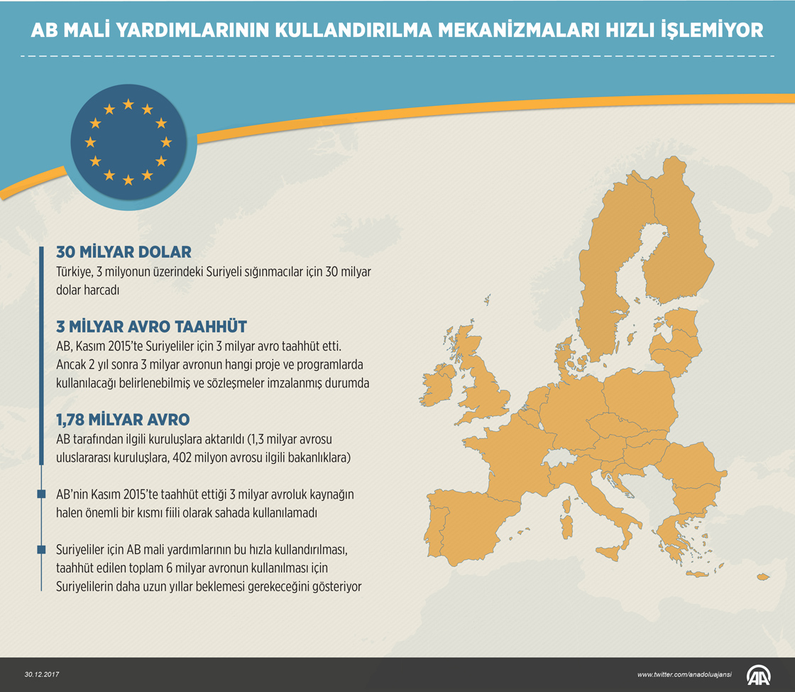 AB'nin mali yardımlarına ilişkin bakanlıktan yapılan yazılı açıklamada, Türkiye'nin 2011'den bu yana Suriye'deki iç karışıklıklardan kaçarak, Türkiye'ye gelen Suriyelilere ev sahipliği yaptığı hatırlatıldı. Türkiye'nin sayıları 3 milyonun üzerinde olan Suriyeliler için 30 milyar doların üzerinde harcama yaptığı kaydedilen açıklamada,"29 Kasım 2015'de düzenlenen Türkiye-AB Zirvesinde, Türkiye ile külfet paylaşımı kararı çerçevesinde, Türkiye’de geçici korumadan yararlanan Suriye vatandaşlarına yönelik AB, 3 milyar avro mali yardım sağlamayı taahhüt etmişti." hatırlatması yapıldı. Anadolu Ajansı - Kemal Delikmen