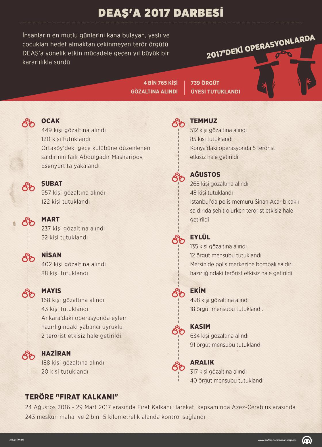 Türkiye'nin barış ve huzurunu bozmaya çalışan, insanların en mutlu günlerini kana bulayan, yaşlı ve çocukları hedef almaktan çekinmeyen terör örgütü DEAŞ'a yönelik etkin mücadele, geçen yıl büyük bir kararlılıkla sürdürüldü. Türkiye'ye yönelik faaliyetlerine 2013'ten itibaren başlayan DEAŞ, aynı yıl Türkiye tarafından terör örgütü listesine alındı. 2014'te DEAŞ'ın Musul'u ele geçirmesinden sonra Türkiye'nin Musul Başkonsolosluğunda görevli 49 kişiyi rehin almasıyla artan DEAŞ tehdidi, ilerleyen süreçte yurt dışından ülke içerisine taşındı.