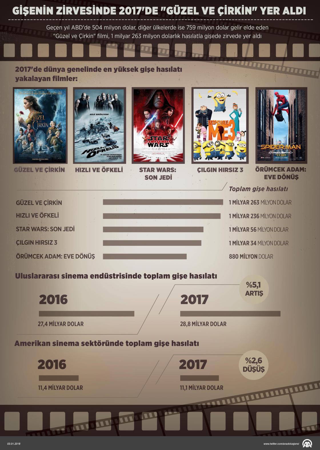 "Güzel ve Çirkin (Beauty and the Beast)", geçen yıl dünya genelinde en çok hasılat elde eden sinema yapıtı olarak gişeyi zirvede tamamladı. Fransız yazar Gabrielle-Suzanne de Villeneuve tarafından 18'inci yüzyılda yazılan masalın uyarlaması olan "Güzel ve Çirkin" filmi, geçen yıl ABD'de 504 milyon dolar, diğer ülkelerde de 759 milyon dolar gelir elde etti. Film, 1 milyar 263 milyon dolarlık hasılatla gişede zirvede yer aldı.