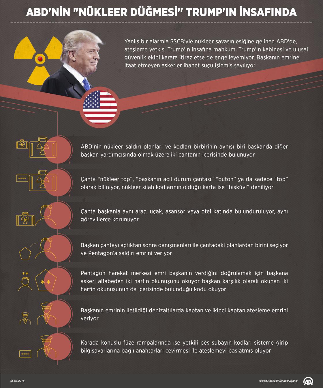 ABD Başkanı Donald Trump ile Kuzey Kore lideri Kim Jong-un arasındaki nükleer düğme polemiğinin ardından dikkatler, ABD’de olası bir nükleer saldırıda talimat sürecinin nasıl işlediğine çevrildi. ABD’de nükleer saldırı emrinin işleyiş sürecine göre, nükleer silah kullanma yetkisi sadece başkana ait. Halihazırda bu yetki, kararlarıyla büyük tartışmalara neden olan Donald Trump'ın insafında. ( Yasin Demirci - Anadolu Ajansı )05 Ocak 2018•Güncelleme: 05 Ocak 2018