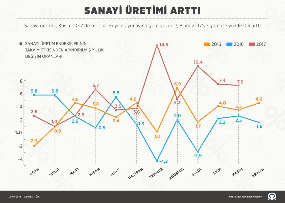 Türkiye İstatistik Kurumu (TÜİK), Kasım 2017'ye ilişkin sanayi üretim endeksi sonuçlarını açıkladı. Takvim etkisinden arındırılmış sanayi üretim endeksi, Kasım 2017'de bir önceki yılın aynı ayına göre yüzde 7, mevsim ve takvim etkisinden arındırılmış sanayi üretimi ise kasımda ekime göre yüzde 0,3 arttı. ( Muhammed Ali Yiğit - Anadolu Ajansı )08 Ocak 2018•Güncelleme: 08 Ocak 2018