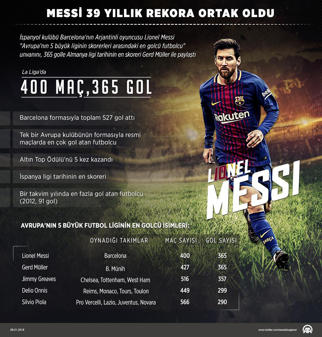 İspanyol kulübü Barcelona'da forma giyen Lionel Messi, 365 golle Almanya ligi tarihinin en skoreri Gerd Müller'in 39 yıldır kırılamayan "Avrupa'nın 5 büyük liginin skorerleri arasındaki en golcü futbolcu" rekoruna ortak oldu. Dünyada yılın en iyi futbolcusuna verilen Altın Top Ödülü'nü 5 kez kazanan, İspanya ligi tarihinin en skoreri unvanını taşıyan, 2012'de kulüp ve milli takım formasıyla ulaştığı 91 golle bir takvim yılında en fazla gol atan futbolcu olan Messi, kariyerine yeni bir unvan daha ekledi. Barcelona A Takımı formasını 16 Ekim 2004'ten bu yana giyen Messi, ligin 18. haftasında Levante filelerini havalandırarak İspanya Birinci Ligi'ndeki (La Liga) toplam gol sayısını 365'e çıkardı. 30 yaşındaki forvet oyuncusu böylece efsane Alman oyuncu Gerd Müller'e ait Avrupa'nın 5 büyük liginin skorerleri arasında en fazla gol atan futbolcu rekoruna ortak oldu. ( Kemal Delikmen - Anadolu Ajansı )08 Ocak 2018•Güncelleme: 08 Ocak 2018