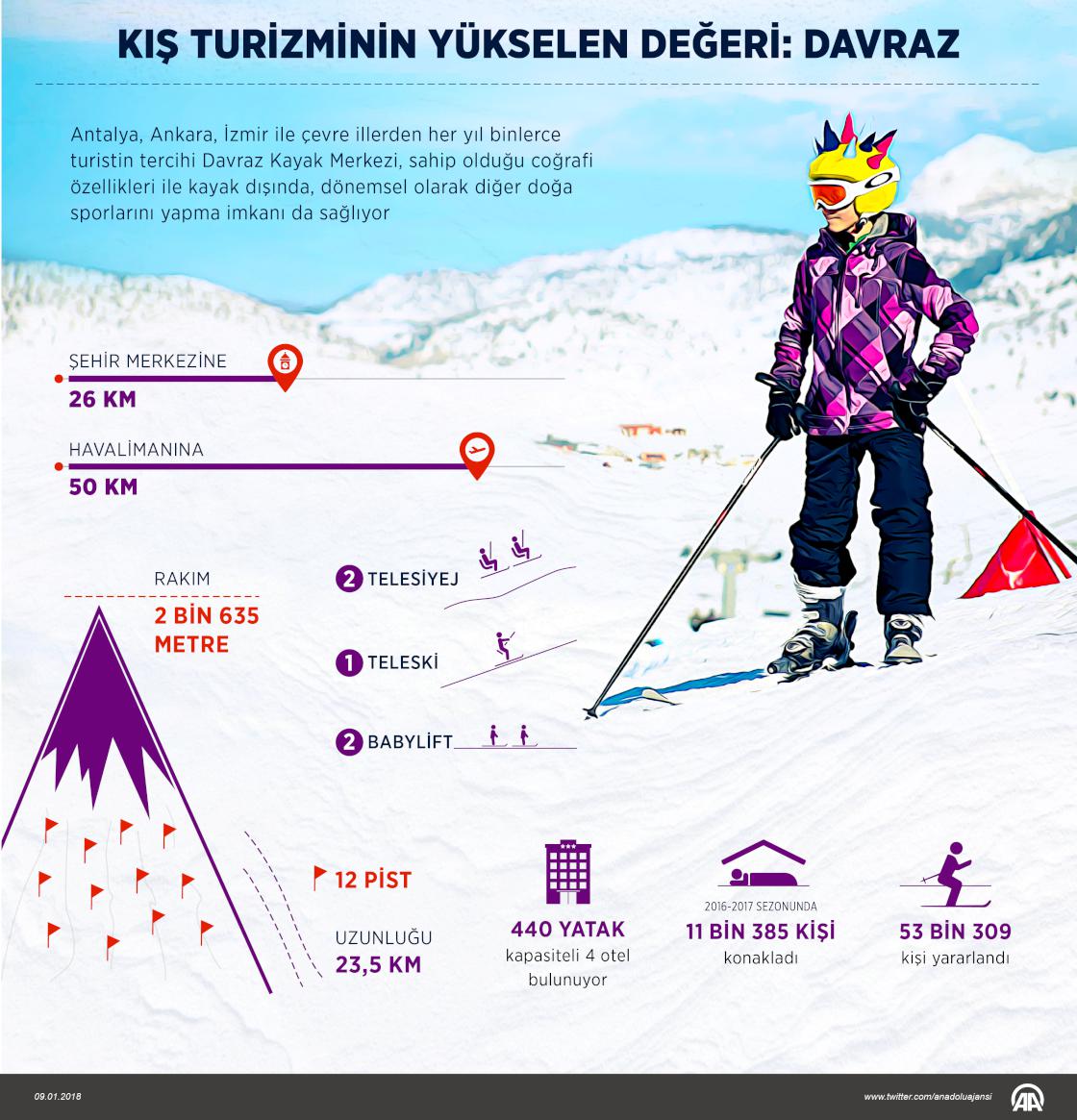 Isparta'daki Davraz Kayak Merkezi, son zamanlardaki yatırımlarla kış ve doğa turizminin batı Akdeniz'deki merkezi haline geldi. Şehir merkezine 26, Isparta Süleyman Demirel Havalimanı'na 50 kilometre mesafede bulunan, Antalya, Ankara, İzmir ve çevre illerden her yıl binlerce turistin tercihi olan 2 bin 635 metre rakımlı Davraz, sahip olduğu coğrafi özellikleriyle kayak dışında dönemsel olarak diğer doğa sporlarını yapma imkanı da sağlıyor. ( Yasin Demirci - Anadolu Ajansı )09 Ocak 2018•Güncelleme: 09 Ocak 2018