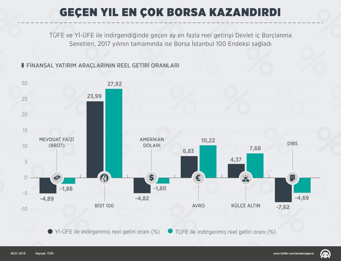 Tüketici Fiyatları Endeksi (TÜFE) ve Yurt İçi Üretici Fiyat Endeksi (Yİ-ÜFE) ile indirgendiğinde en fazla reel getiri, geçen ay Devlet iç Borçlanma Senetleri'nden (DİBS), 2017 yılında ise Borsa İstanbul (BIST) 100 Endeksi'nden elde edildi. ( Yasin Demirci - Anadolu Ajansı )09 Ocak 2018•Güncelleme: 09 Ocak 2018