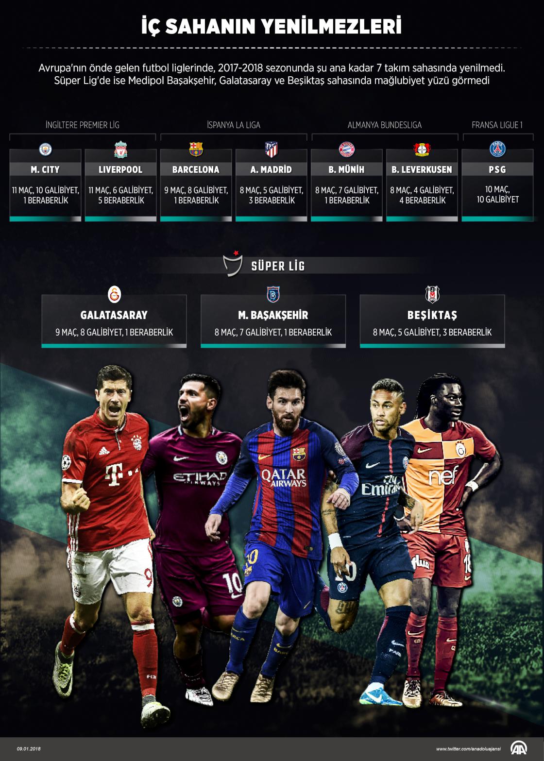 Avrupa'nın önde gelen futbol liglerinde, 2017-2018 sezonunda şu ana kadar 7 takım evinde yenilmedi. İngiltere'de (Premier Lig) Manchester City, Liverpool, İspanya'da (La Liga) Barcelona, Atletico Madrid, Almanya'da (Bundesliga) Bayern Münih, Bayer Leverkusen, Fransa'da (Ligue 1) Paris Saint-Germain (PSG) sahasında mağlubiyet yüzü görmedi. İtalya'da (Serie A) ise tüm takımlar sahasında en az bir kez mağlubiyet yaşadı. Avrupa'nın önde gelen liglerinde evinde kaybetmeyen 7 takımın yanı sıra Süper Lig'de de Medipol Başakşehir, Galatasaray ve Beşiktaş iç sahada mağlubiyet yaşamadı. ( Kemal Delikmen - Anadolu Ajansı )09 Ocak 2018•Güncelleme: 09 Ocak 2018