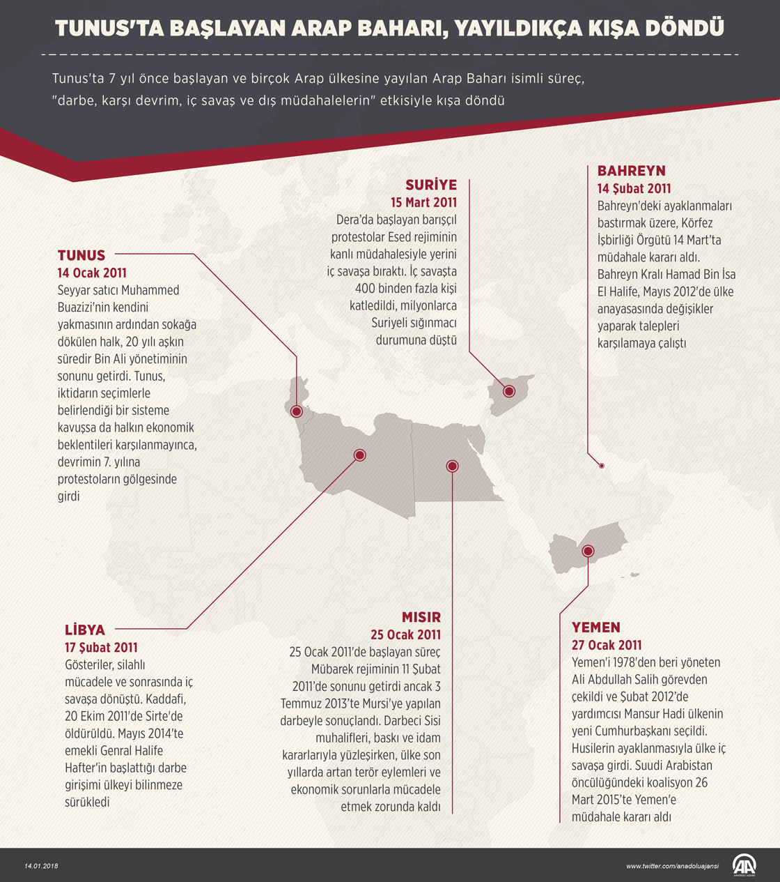 Tunus'ta yedi yıl önce "ekmek, onur ve özgürlük" sloganıyla başlayan ve kısa sürede pek çok Ortadoğu ve Kuzey Afrika ülkesini etkisi altına "Arap Baharı" isimli süreç "darbe, karşı devrim, iç savaş ve dış müdahalelerin" etkisiyle kışa döndü. ( Muhammed Ali Yiğit - Anadolu Ajansı )14 Ocak 2018•Güncelleme: 14 Ocak 2018