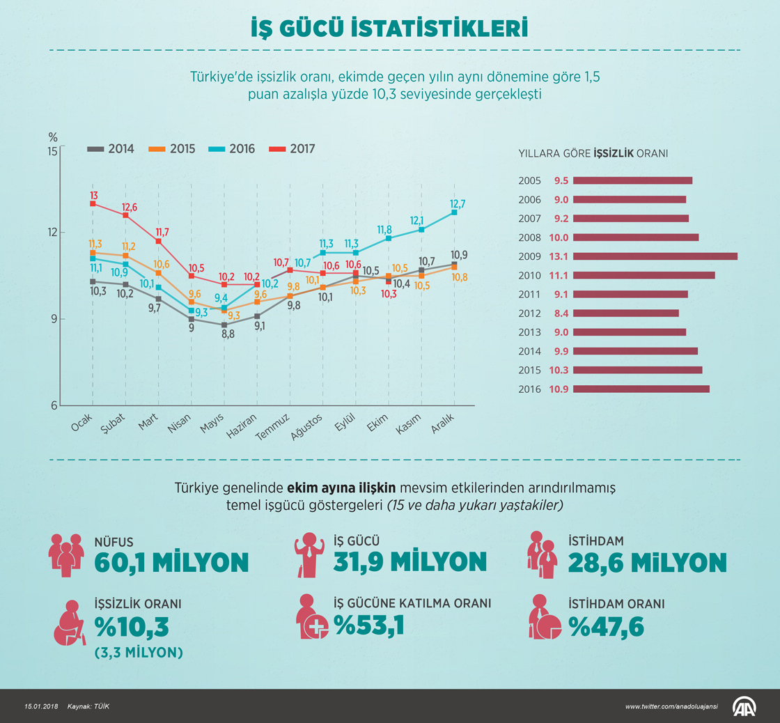 Türkiye İstatistik Kurumu (TÜİK), 2017 yılının ekim ayına ilişkin iş gücü istatistiklerini açıkladı. Türkiye'de işsizlik oranı, Ekim 2017'de bir önceki yılın aynı dönemine göre 1,5 puan azalarak yüzde 10,3 oldu. Söz konusu dönemde işsiz sayısı 360 bin kişi azalarak 3 milyon 287 bin kişi olarak kayıtlara geçti. ( Ahmet Burak Özkan - Anadolu Ajansı )15 Ocak 2018•Güncelleme: 15 Ocak 2018