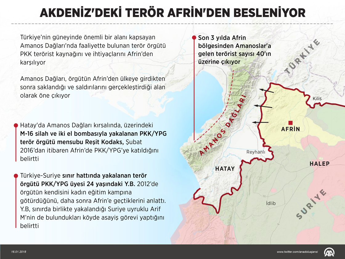 Türkiye’nin güneyinde önemli bir alanı kapsayan Amanos Dağları'nda faaliyette bulunan terör örgütü PKK terörist kaynağını ve ihtiyaçlarını Afrin'den karşılıyor. Bölgede son zamanlarda yakalanan ve teslim olan teröristlerin ifadelerine de bu durum yansırken, ele geçirilen mühimmatların ABD ve Rus menşeli olduğu görülüyor. (Grafik: AA/ Yasin Demirci)16 Ocak 2018•Güncelleme: 16 Ocak 2018