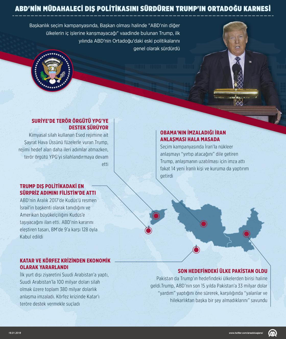 Başkanlık seçim kampanyasında “Önce Amerika” söylemini öne çıkararak ABD’nin denizaşırı operasyonlarını azaltacağını savunan Başkan Donald Trump, görevdeki ilk yılında özellikle Ortadoğu'da ABD'nin "müdahaleci politikalarını" devam ettirdi. Trump’ın seçim kampanyasında en dikkat çekici söylemlerden biri Başkan olması durumunda "ABD’nin diğer ülkelerin iç işlerine karışmayacağını" dile getirmesi ve ardından “ABD’nin ülke kurma dönemi hızla sonlandırılacak” ifadesini kullanmasıydı. ( Muhammed Ali Yiğit - Anadolu Ajansı )18 Ocak 2018•Güncelleme: 18 Ocak 2018