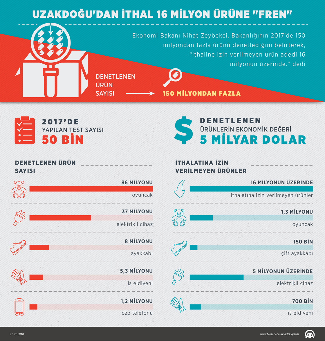 Ekonomi Bakanı Zeybekci, "2017'de yaklaşık 50 bin testle Uzakdoğu menşeli, 5 milyar dolar ithalat değerine sahip 150 milyondan fazla ürünü denetledik. İthaline izin verilmeyen ürün adedi 16 milyonun üzerinde." dedi.