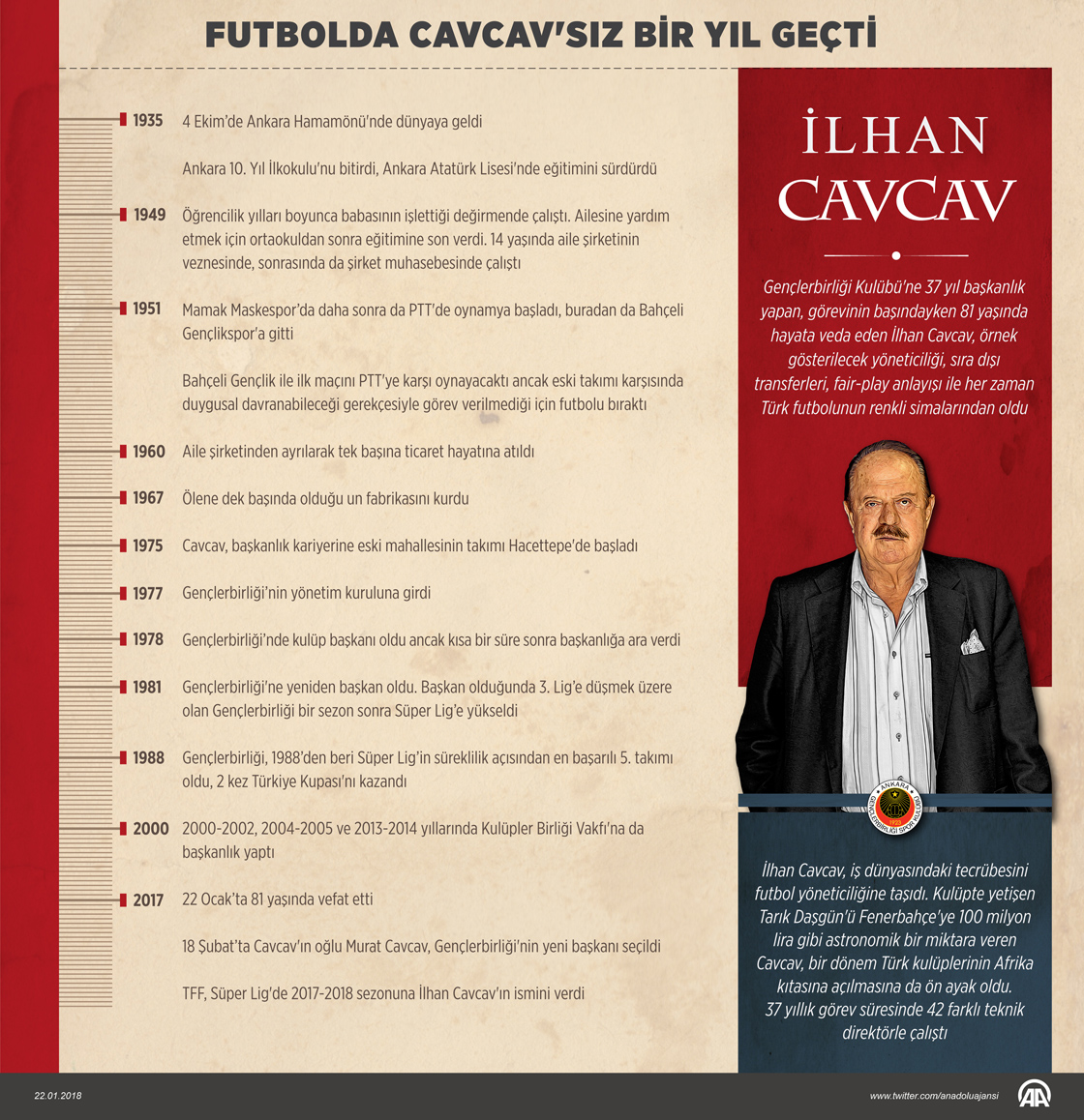 Gençlerbirliği Kulübünün duayen başkanı İlhan Cavcav'ın vefatının üzerinden bir yıl geçti. Başkent kulübüne 37 yıl başkanlık yapan ve geçen sene 22 Ocak'ta 81 yaşında hayata veda eden İlhan Cavcav, örnek gösterilecek yöneticiliği, sıra dışı transferleri, fair play yönüyle her zaman Türk futbolunun renkli simalarından oldu. ( Kemal Delikmen - Anadolu Ajansı )22 Ocak 2018•Güncelleme: 22 Ocak 2018