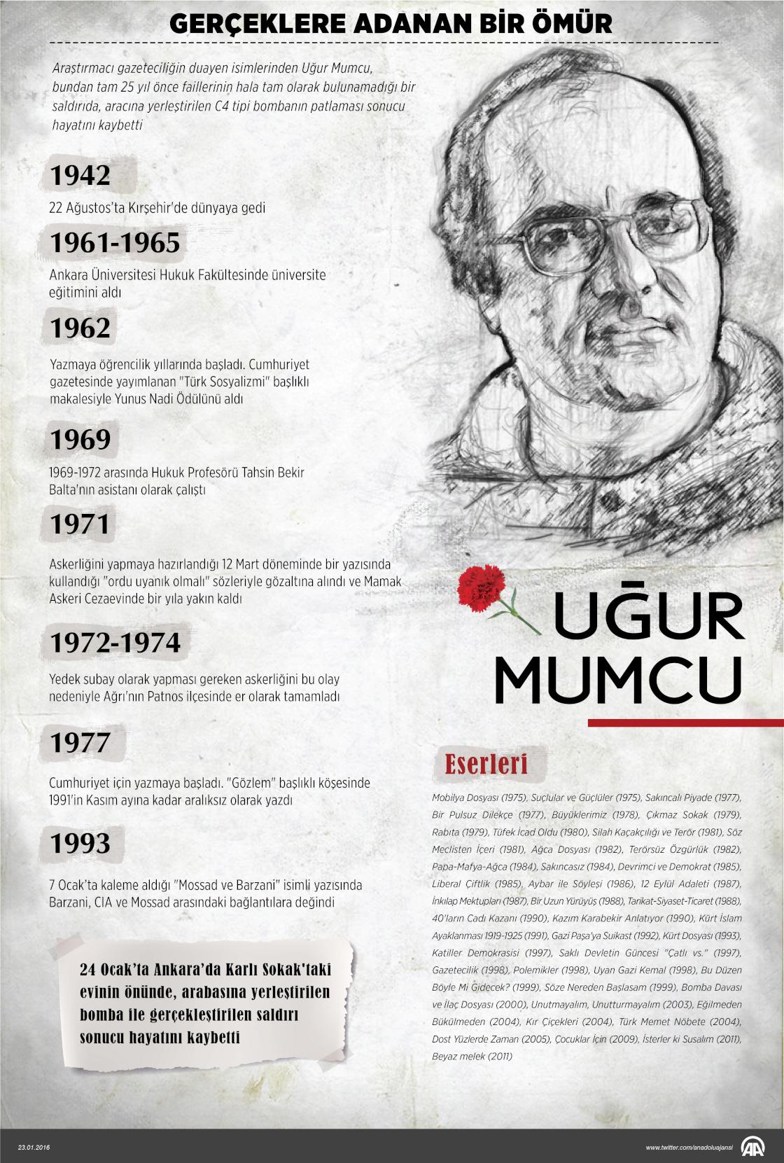 Araştırmacı gazeteciliğin duayen isimlerinden Uğur Mumcu, tam 25 yıl önce faillerinin hala tam olarak bulunamadığı bir saldırıda, aracına yerleştirilen C4 tipi bombanın patlaması sonucu hayatını kaybetti. 51 yıllık kısa yaşantısına onlarca kitap ve yüzlerce makale sığdıran Mumcu'nun "gerçekleri aradığı" yazıları, hala geleceğe ışık tutmaya devam ediyor. ( Gözde Gültekinler - Anadolu Ajansı )23 Ocak 2018•Güncelleme: 23 Ocak 2018