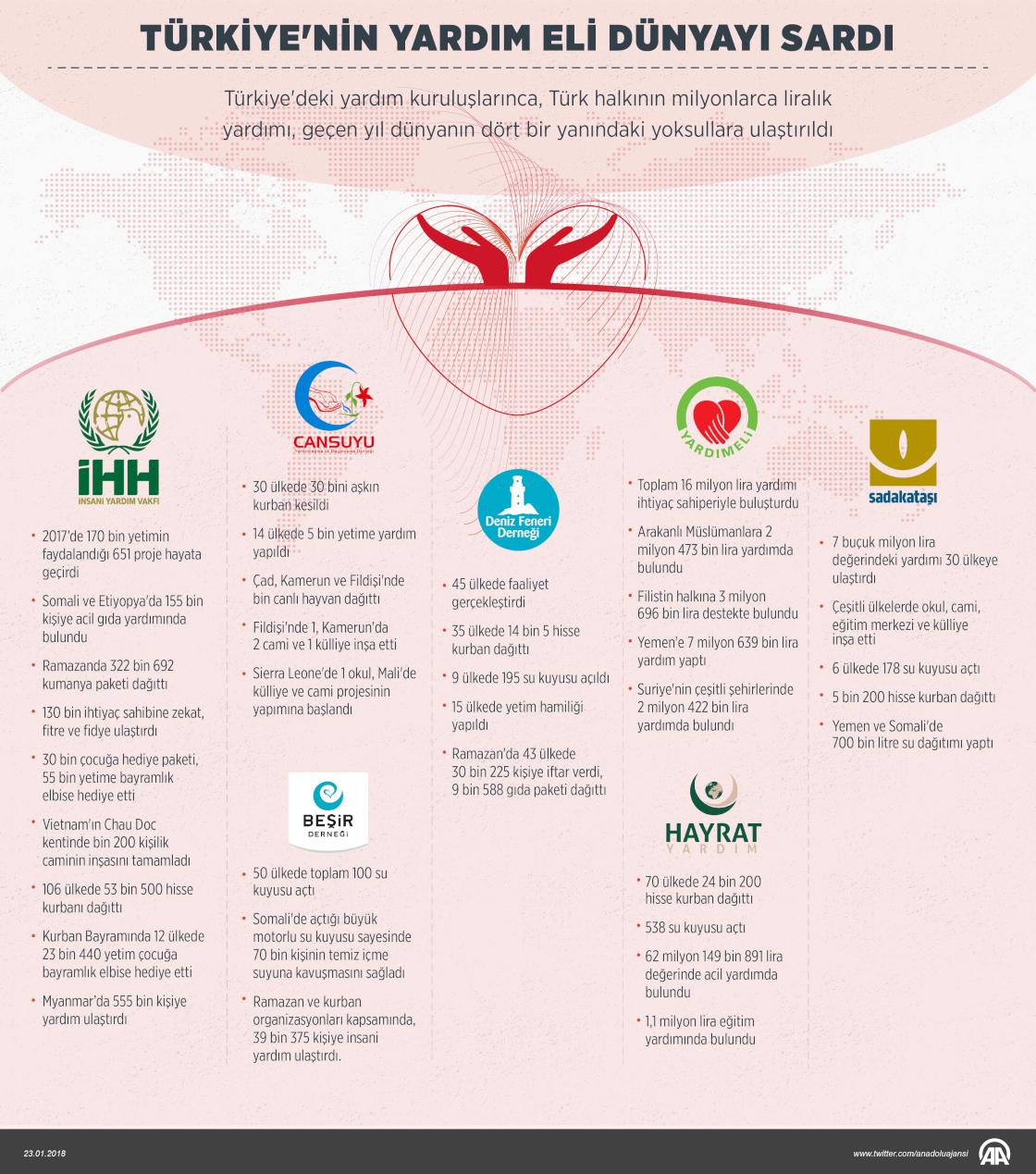 Yardımlarıyla "Dünyanın en cömert ülkesi" sıfatına sahip olan Türkiye, geçen yıl deprem, doğal afet, iç savaş, ekonomik sıkıntılar, siyasi çekişmeler, hastalık, kuraklık gibi çeşitli olumsuzluklar nedeniyle ortaya çıkan insani ihtiyaçların giderilmesinde yardım kuruluşları eliyle milyonlarca lirayı ihtiyaç sahiplerine ulaştırdı. ( Gözde Gültekinler - Anadolu Ajansı )23 Ocak 2018•Güncelleme: 24 Ocak 2018