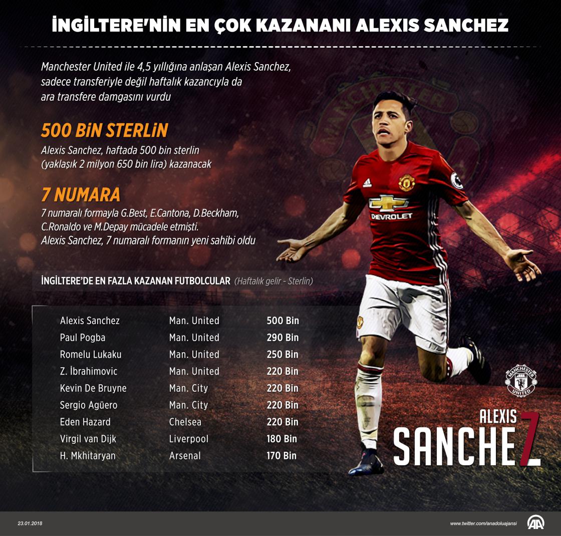 İngiltere Premier Lig ekiplerinden Arsenal ile sözleşmesini uzatmayan ve Manchester United'a imza atan Alexis Sanchez, sadece ayrılık kararıyla değil kazancıyla da ara transfer dönemine damgasını vurdu. Portekizli teknik adam Jose Mourinho'nun teknik direktörlüğünü yaptığı Manchester United ile 4,5 yıllığına anlaşan 29 yaşındaki Şilili futbolcu, İngiliz basınında yer alan iddialara göre haftada kazanacağı 500 bin sterlinlik (yaklaşık 2 milyon 650 bin lira) geliriyle bu alanda zirveye yerleşti. ( Kemal Delikmen - Anadolu Ajansı )23 Ocak 2018•Güncelleme: 23 Ocak 2018