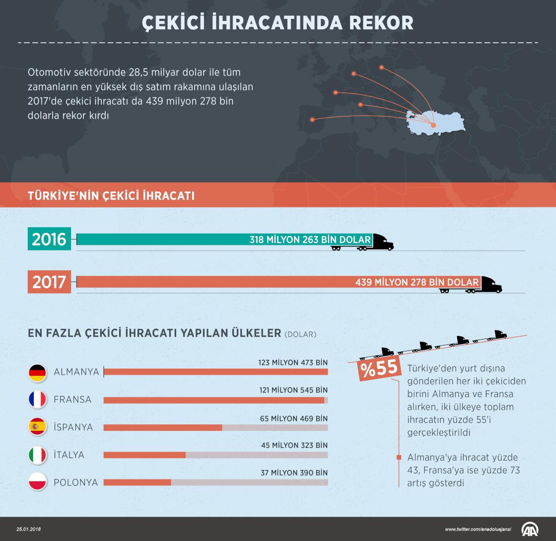 Otomotiv sektöründe 28,5 milyar dolar ile tüm zamanların en yüksek dış satım rakamına ulaşılan 2017'de çekici ihracatı da 439 milyon 278 bin dolarla rekor kırdı. Türkiye'den yurt dışına gönderilen her iki çekiciden birini Almanya ve Fransa alırken, iki ülkeye toplam ihracatın yüzde 55'i gerçekleştirildi. ( Yasin Demirci - Anadolu Ajansı )25 Ocak 2018•Güncelleme: 25 Ocak 2018
