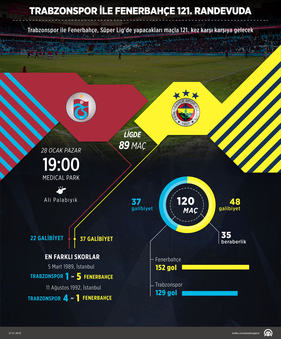 Trabzonspor ile Fenerbahçe, Süper Lig'de yarın yapacakları maçla 121. kez karşı karşıya gelecek. Trabzon Hüseyin Avni Aker Stadı'nda 13 Şubat 1974'te yapılan ve 0-0 sonuçlanan Türkiye Kupası çeyrek final maçıyla başlayan 44 yıllık rekabette, galibiyet sayısında Fenerbahçe'nin 11 farkla üstünlüğü bulunuyor. ( Gözde Gültekinler - Anadolu Ajansı )27 Ocak 2018•Güncelleme: 27 Ocak 2018