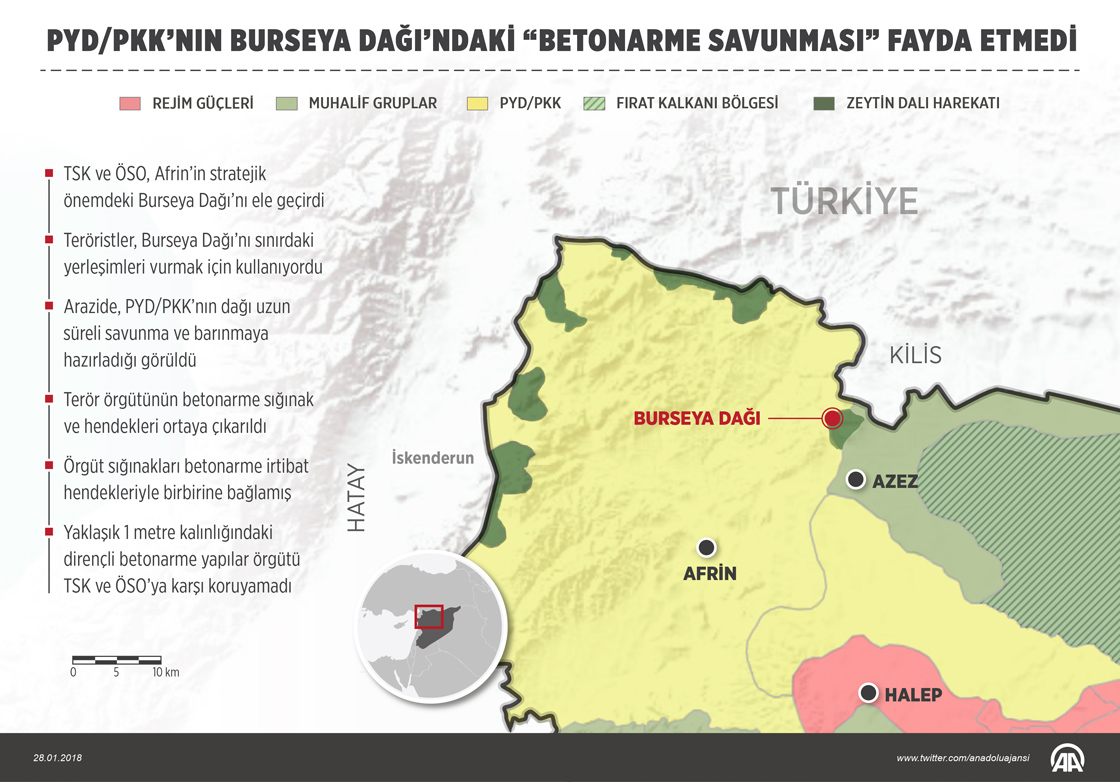 Türk Silahlı Kuvvetlerinin (TSK), Zeytin Dalı Harekatı’nda terör örgütü PYD/PKK’dan ele geçirdiği Burseya Dağı'nda, teröristlerin uzun süreli barınma için hazırlık yaptığı betonarme yapılar bulundu. ( Muhammed Ali Yiğit - Anadolu Ajansı )28 Ocak 2018•Güncelleme: 28 Ocak 2018