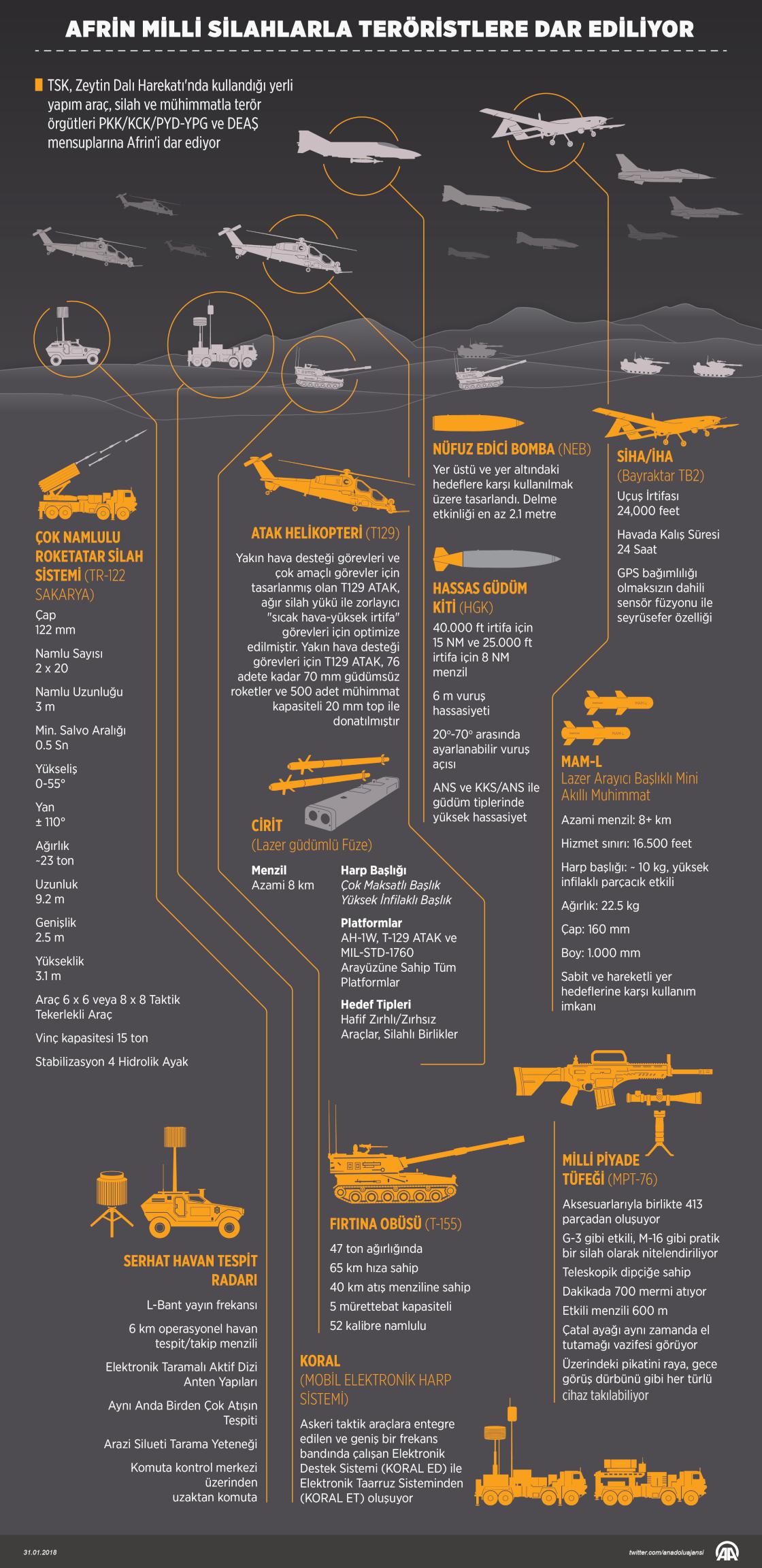 Türk Silahlı Kuvvetleri (TSK), Zeytin Dalı Harekatı'nda kullandığı yerli yapım radar karıştırıcı, Fırtına obüsü, kirpi, çok namlulu roketatar, ATAK helikopter ve hassas güdümlü kitler gibi araç, silah ve mühimmatla terör örgütleri PKK/KCK/PYD-YPG ve DEAŞ mensuplarına Afrin'i dar ediyor. ( Murat Usubaliev - Anadolu Ajansı )31 Ocak 2018•Güncelleme: 31 Ocak 2018