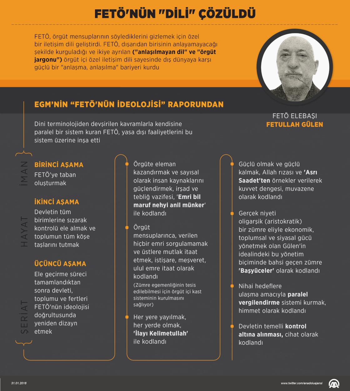 FETÖ, örgüt mensuplarının söylediklerini gizlemek için özel bir iletişim dili geliştirdi. FETÖ, dışarıdan birisinin anlayamayacağı şekilde kurguladığı ve ikiye ayrılan ("anlaşılmayan dil" ve "örgüt jargonu") örgüt içi özel iletişim dili sayesinde dış dünyaya karşı güçlü bir "anlaşma, anlaşılma" bariyeri kurdu. ( Yasin Demirci - Anadolu Ajansı )31 Ocak 2018•Güncelleme: 31 Ocak 2018
