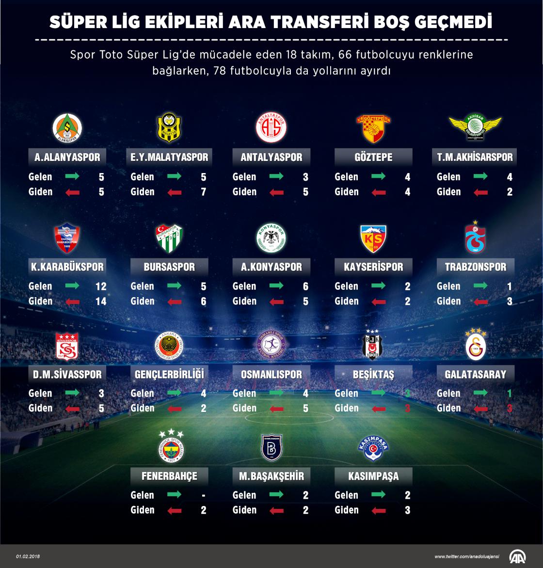 Spor Toto Süper Lig ekipleri, 2017-2018 futbol sezonu ara transfer döneminde eksiklerini tamamlarken, birçok yıldız futbolcu da farklı kulüplere transfer oldu. Ligde mücadele eden 18 takım, toplamda 66 futbolcuyu kadrosuna katarken, 78 oyuncuyla da yollarını ayırdı. ( Muhammed Ali Yiğit - Anadolu Ajansı )01 Şubat 2018•Güncelleme: 01 Şubat 2018