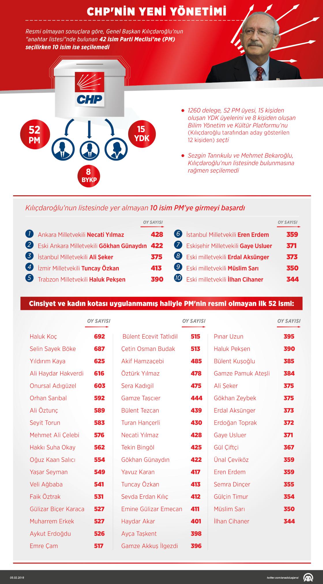 CHP'nin 36'ncı Olağan Kurultayı'nda, 52 PM üyesi ile 15 kişiden oluşan YDK üyelerini ve 12 kişiden oluşan BYKP 8 üyesini belirlemek için yapılan seçimin sonuçları açıklandı. ( Gözde Gültekinler - Anadolu Ajansı )