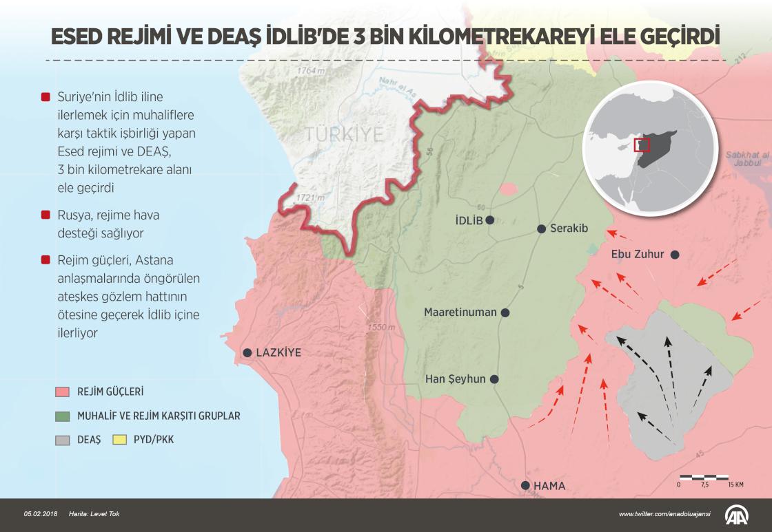 Esed rejimi ve DEAŞ'ın, Suriye'nin İdlib gerginliği azaltma bölgesinde muhaliflere karşı ilerlemek için taktik işbirliği sürüyor. Rejim ve DEAŞ, koordineli saldırılarla 3 bin kilometrekare alanı ele geçirdi. Rusya, İdlib'in güney ve güneydoğusundaki ilerlemede rejime hava desteği sağlıyor. Rejim güçleri, Astana anlaşmalarında öngörülen ateşkes gözlem hattının ötesine geçti. ( Ahmet Burak Özkan - Anadolu Ajansı )05 Şubat 2018•Güncelleme: 05 Şubat 2018