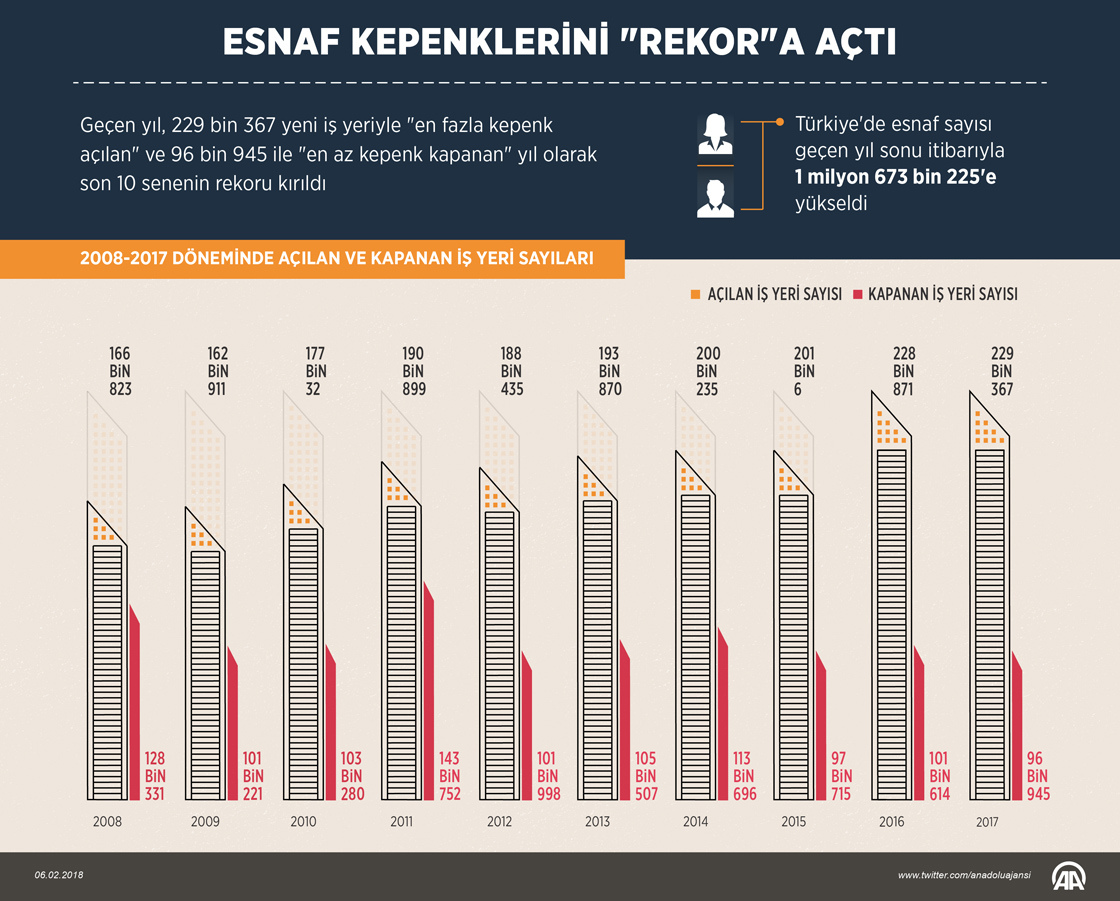 Türkiye'de esnaflarca açılan iş yeri sayısı geçen yıl sonu itibarıyla son 10 yılın rekor seviyesine ulaştı.