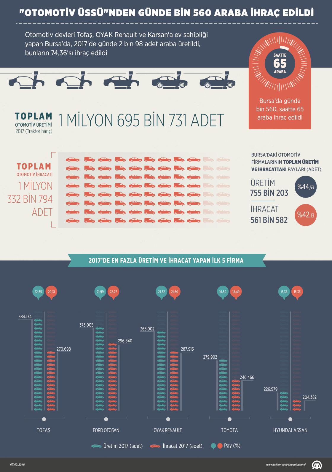 Otomotiv devleri Tofaş, OYAK Renault ve Karsan'a ev sahipliği yapan Bursa'da, 2017'de günde 2 bin 98 araç üretildi, bunların bin 560 adedi (yüzde 74,36'ı) ihraç edildi. Bursa'da kurulu Tofaş, OYAK Renault ve Karsan, traktörler hariç geçen seneki toplam 1 milyon 695 bin 731 adetlik üretimin yüzde 44,53'ünü (755 bin 203 adet), 1 milyon 332 bin 794 adetlik ihracatın da yüzde 42,13'ünü (561 bin 582) gerçekleştirdi. Tofaş'ın üretimde lider, ihracatta üçüncü sırada yer aldığı 2017'de, OYAK Renault üretimde üçüncü, ihracatta ikinci oldu. ( Kemal Delikmen - Anadolu Ajansı )07 Şubat 2018•Güncelleme: 07 Şubat 2018