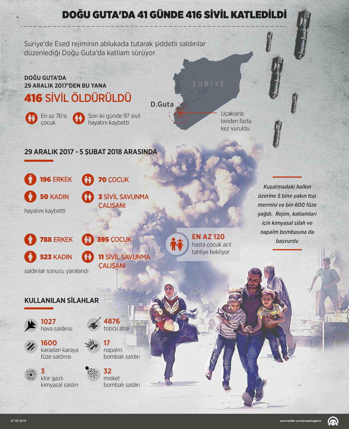 Doğu Guta'daki AA muhabirlerinin Sivil Savunma (Beyaz Baretliler) ekiplerinden aldığı bilgilere göre, saldırıların şiddetlendiği 29 Aralık 2017- 5 Şubat 2018 döneminde 319 sivil yaşamını yitirdi. 39 günlük dönemde 788'si erkek, 523'ü kadın, 395'i çocuk ve 11'i Sivil Savunma görevlisi toplam bin 717 sivil yaralandı. Kuşatmadaki halkın üzerine 5 bine yakın top mermisi ve bin 600 füze yağdı. Rejim, katiamları için kimyasal silah ve napalm bombasına da başvurdu. ( Ahmet Burak Özkan - Anadolu Ajansı )07 Şubat 2018•Güncelleme: 07 Şubat 2018