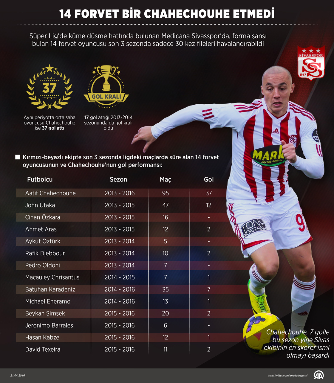 Spor Toto Süper Lig'de bu sezon ligin en az gol sevinci yaşayan ikinci takımı olan Medicana Sivasspor'da, ligde son 3 sezonda forma giyen 14 forvet oyuncusu 30 kez, aynı periyotta Fas asıllı Fransız orta saha oyuncusu Aatif Chahechouhe ise 37 kez fileleri havalandırdı.