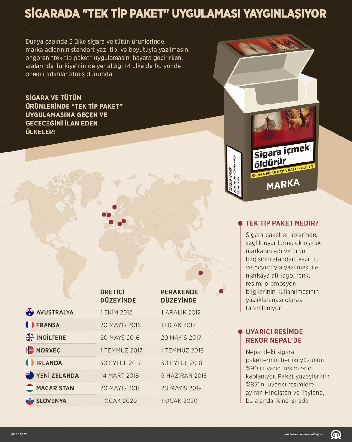 Dünya çapında 5 ülke sigara ve tütün ürünlerinde marka adlarının standart yazı tipi ve boyutuyla yazılmasını öngören “tek tip paket” uygulamasını hayata geçirirken, aralarında Türkiye’nin de yer aldığı 14 ülke de bu yönde önemli adımlar atmış durumda. Paketlerin ön tarafında yazılı uyarılar yer alırken arka tarafında da sigaranın yol açtığı zararları gösteren görseller bulunuyor. ( Yasin Demirci - Anadolu Ajansı )08 Şubat 2018•Güncelleme: 08 Şubat 2018
