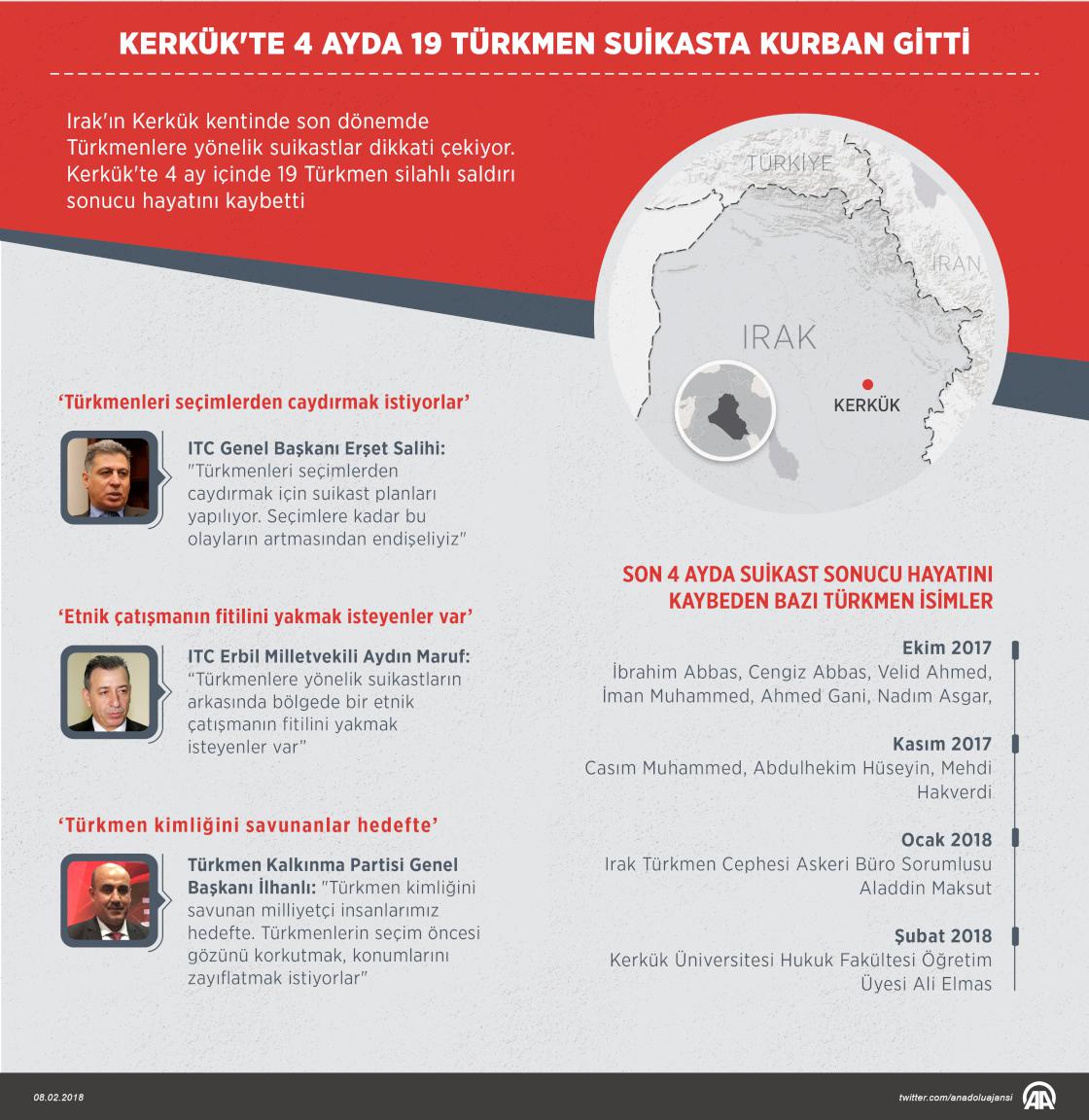Irak'ın Kerkük kentinde son dönemde Türkmenlere yönelik suikastlar dikkati çekiyor. Kerkük'te 4 ay içinde 19 Türkmen silahlı saldırı sonucu hayatını kaybetti. Zengin petrol yataklarına sahip Kerkük'teki Türkmenlere karşı 16 Ekim 2017'den bu yana farklı tarihlerde çeşitli silahlı saldırılar gerçekleştirildi. Saldırıların "suikast" şeklinde düzenlenmesi ve çoğunun "faili meçhul" kalması, kentteki tüm Türkmenleri tedirgin etmeye başladı. ( Kemal Delikmen - Anadolu Ajansı )08 Şubat 2018•Güncelleme: 08 Şubat 2018