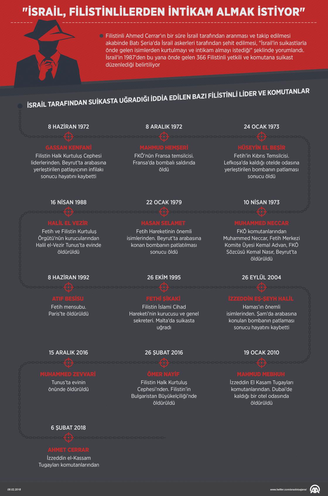 Filistinli Ahmed Cerrar'ın bir süre İsrail tarafından aranması ve takip edilmesi akabinde Batı Şeria'da İsrail askerleri tarafından şehit edilmesi, "İsrail'in suikastlarla önde gelen isimlerden kurtulmayı ve intikam almayı istediği" şeklinde yorumlandı. Hamas'ın silahlı kanadı İzzeddin el-Kassam Tugayları'nın "Kassam'ın şehit komutanlarından" diye bahsettiği Cerrar'ın şehit edilmesi, İsrail'in yıllarca Filistinli liderlere ve komutanlara yaptığı suikast ve saldırıları akıllara getirdi. ( Yasin Demirci - Anadolu Ajansı )08 Şubat 2018•Güncelleme: 08 Şubat 2018
