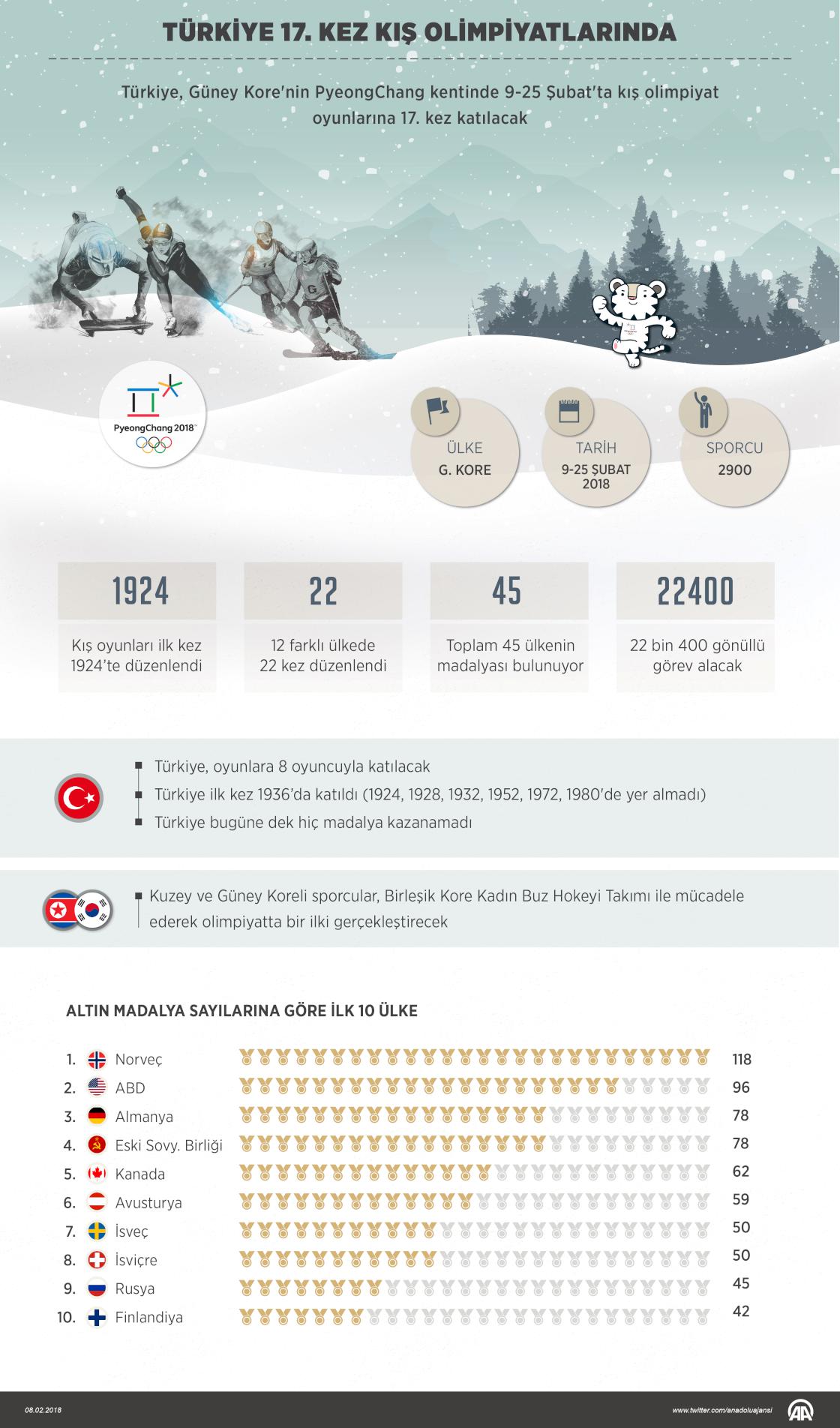 Türkiye, Güney Kore'nin PyeongChang kentinde 9-25 Şubat'ta düzenlenecek organizasyonla Kış Olimpiyat Oyunları'na 17. kez katılacak.İlk kez 1936'da Garmisch-Partenkirchen'deki oyunlara katılarak kış oyunları serüveni başlayan Türk sporcular, PyeongChang'daki organizasyonla aralıksız 10. kış olimpiyatlarında da yer almış olacak. Oyunlara bugüne dek 16 kez katılma şansı elde eden Türkiye, 1924, 1928, 1932, 1952, 1972 ve 1980'deki olimpiyatlarda yer almadı. Türkiye'yi oyunlarda temsil eden sporcu sayısı PyeongChang ile 90'dan 98'e yükselecek. Ay-yıldızlılar, 1984'te Saraybosna'da yapılan olimpiyatlardan itibaren bütün oyunlarda yer aldı. ( Kemal Delikmen - Anadolu Ajansı )08 Şubat 2018•Güncelleme: 08 Şubat 2018